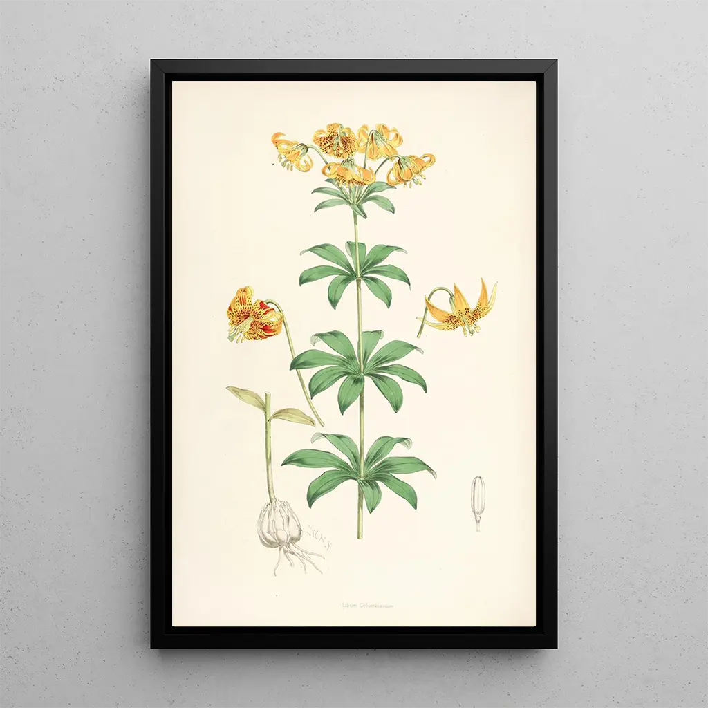 Lilium Columbianum, Walter Hood Fitchin kuvittama taidegrafiikka, juhlistaa luonnon villin kasviston loistoa. Tämä kiehtova taidegrafiikka esittää kukkaa huolellisella yksityiskohtien huomioinnilla, paljastaen sen elävät värit ja elegantin muodon. Keltaisen ja oranssin sävyt sekoittuvat harmonisesti, luoden iloisen ja elävän tunnelman. Fitchin tekniikka, joka yhdistää vesiväriä ja piirustusta, mahdollistaa valon ja varjon vangitsemisen, herättäen tämän upean kasvin eloon. Jokainen sivellinvedos kertoo hänen rakkaudestaan luontoon ja halustaan jakaa tämä kauneus maailman kanssa.