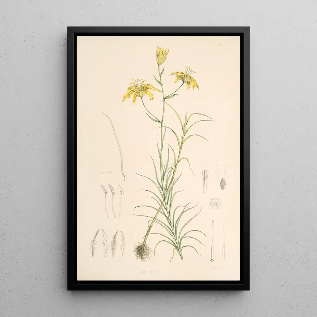 Lilium Davidi, Walter Hood Fitchin merkittävä taidegrafiikka, johdattaa meidät vaikuttavaan kukkivaan maailmaan. Tämä taidegrafiikka korostaa terälehtien hienostuneisuutta ja värien rikkautta, jotka vaihtelevat kirkkaasta valkoisesta kullanhohtoiseen keltaiseen, viitaten auringonvaloon, joka hyväilee kukkia. Fitchin tekniikka, joka yhdistää kasvitieteellisen tarkkuuden ja taiteellisen herkkyyden, luo rauhallisen ja mietiskelevän ilmapiirin. Jokainen yksityiskohta on huolellisesti toteutettu, lehtien suonista kukkien hienovaraisiin sävyihin, kutsuen katsojan arvostamaan luonnon ohikiitävää kauneutta.