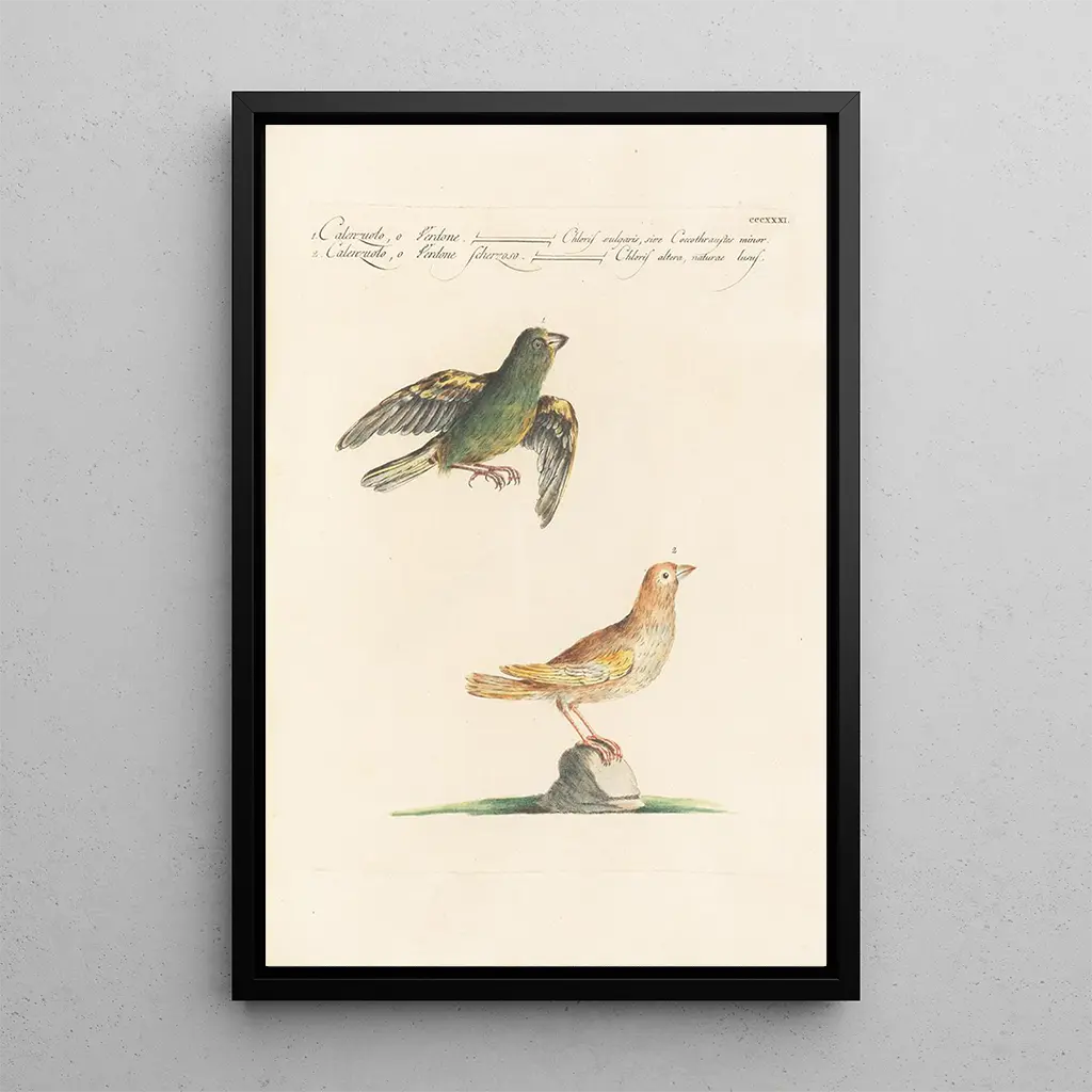 L reproduction Ornithologia methodice digesta Pl313 johdattaa meidät kiehtovaan maailmaan, jossa lintujen hienostuneisuus pääsee oikeuksiinsa. Eloisat värit ja yksityiskohtaiset höyhenkuvat luovat elävän ja dynaamisen tunnelman. Jokainen lintu on esitetty tarkasti, mikä kertoo taiteilijan huolellisesta havainnoinnista. Käytetty tekniikka, todennäköisesti vesiväri tai kaiverrus, mahdollistaa näiden siivekkäiden olentojen keveyden ja arvokkuuden vangitsemisen, samalla tarjoten visuaalisen syvyyden, joka vetää katseen puoleensa. Tämä taideteos kutsuu mietiskelyyn ja ihailuun luonnon kauneutta kohtaan.