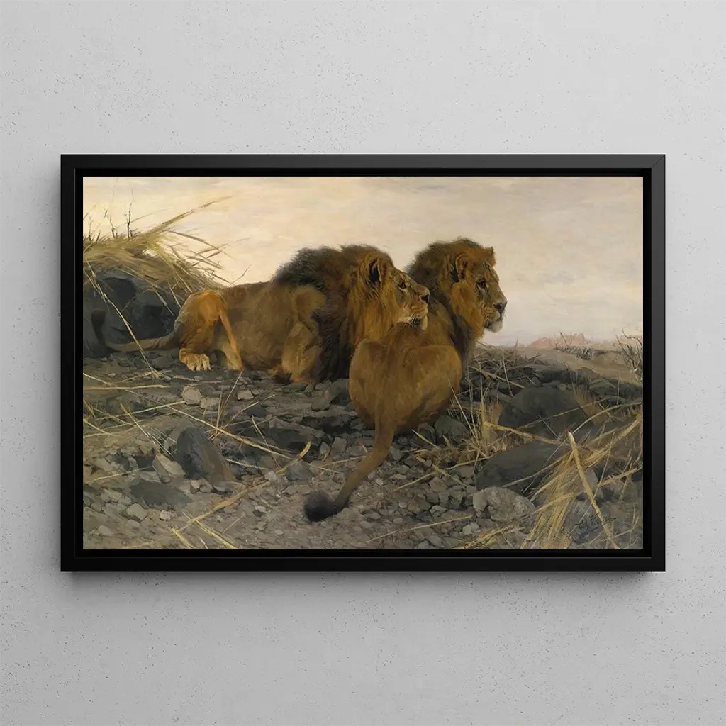 Dans cette reproduction de Lions en veille, Wilhelm Kuhnert nous plonge au cœur de la savane africaine, où la majesté des lions est mise en avant. L'œuvre dépeint deux lions, majestueux et sereins, observant leur environnement avec une intensité captivante. Les couleurs chaudes et terreuses, allant des bruns profonds aux dorés éclatants, évoquent la chaleur du soleil africain. La technique de Kuhnert, qui allie réalisme et détails minutieux, permet de ressentir la puissance tranquille de ces créatures emblématiques, faisant de cette toile un véritable hommage à la faune sauvage.