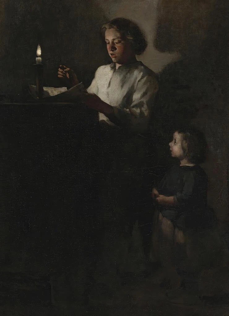 Luettuna kynttilänvalossa, Théodule Ribotin kiehtova teos, vie katsojan pehmeän intiimin maailmaan. Kohtaus kuvaa nuorta naista, joka uppoutuu lukemiseen, valaistuna lepattavan kynttilän hehkusta. Lämpimät värit ja hienovaraiset varjot luovat rauhallisen ja pohdiskelevan tunnelman. Ribotin hallinta valon kanssa, joka leikkii heijastuksilla ja kontrasteilla, herättää tämän teoksen eloon ja tekee hetkessä vallitsevan tunteen lähes kosketeltavaksi. Teos kutsuu pohtimaan sanojen voimaa ja jaettujen hetkien taikaa kirjan kanssa.