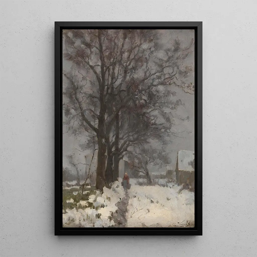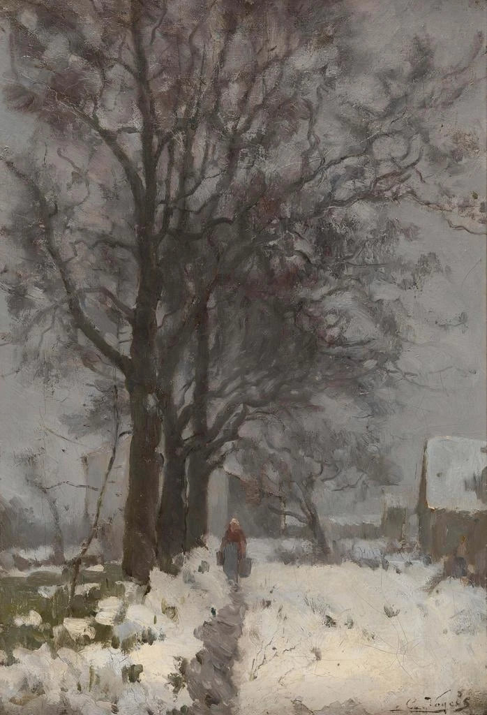 "Paysage enneigé" de Guillaume Vogels évoque un tableau d’un calme saisissant, où la neige recouvre délicatement le paysage. Les nuances de blanc et de bleu se mêlent pour créer une atmosphère paisible, presque onirique. La technique de Vogels, caractérisée par des coups de pinceau fluides, donne vie à la texture de la neige et à la beauté des arbres dénudés. Ce tableau invite à s’évader dans un monde hivernal, où la tranquillité règne en maître, et où chaque flocon semble raconter une histoire.
