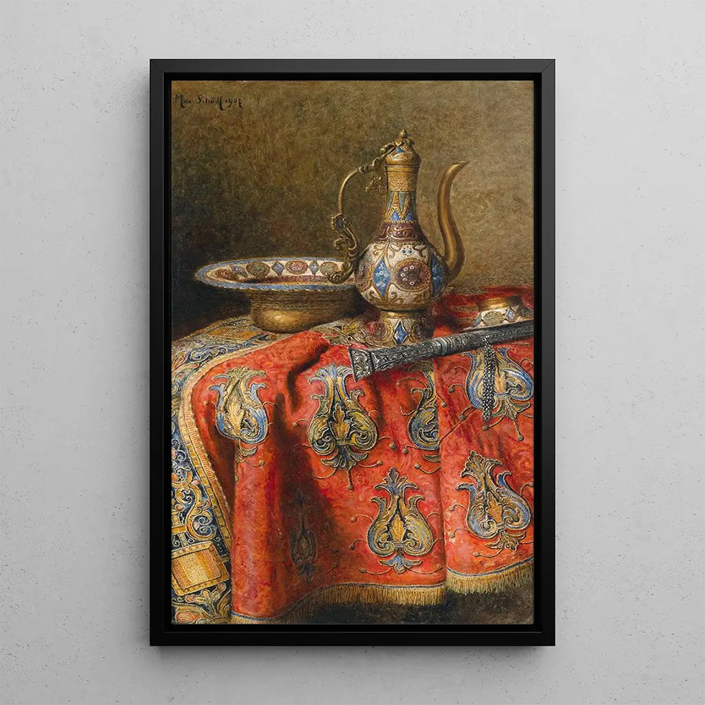 Max Schedlin taidegrafiikan "Luonnollinen asetelma orientaalisilla antiikkiesineillä" uudelleenluomus johdattaa meidät rikkaaseen ja värikkääseen maailmaan. Huolellisesti pöydälle asetetut esineet, kuten maljat ja veistokset, viittaavat kiehtovaan historiaan. Lämpimät ja kultaiset sävyt, yhdistettynä syviin sinisiin sävyihin, luovat sekä rauhoittavan että kiehtovan tunnelman. Schedlin tekniikka, joka yhdistää realismia ja impressionistisia vivahteita, herättää jokaisen yksityiskohdan eloon, muuttaen tämän asetelman todelliseksi taideteokseksi katseltavaksi. Jokainen elementti vaikuttaa kertovan tarinan, kutsuen katsojan pohtimaan näiden antiikkiesineiden menneisyyttä.
