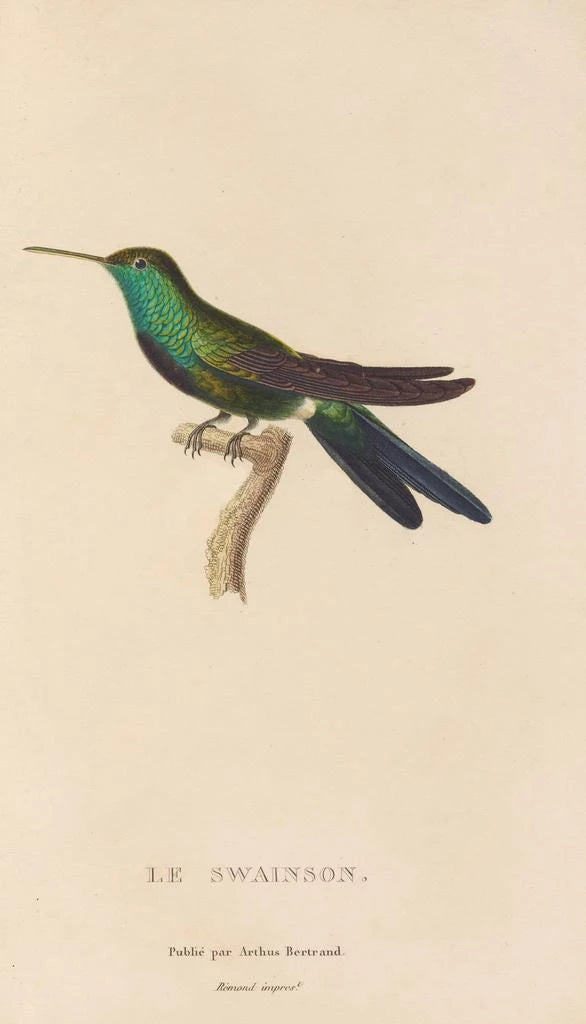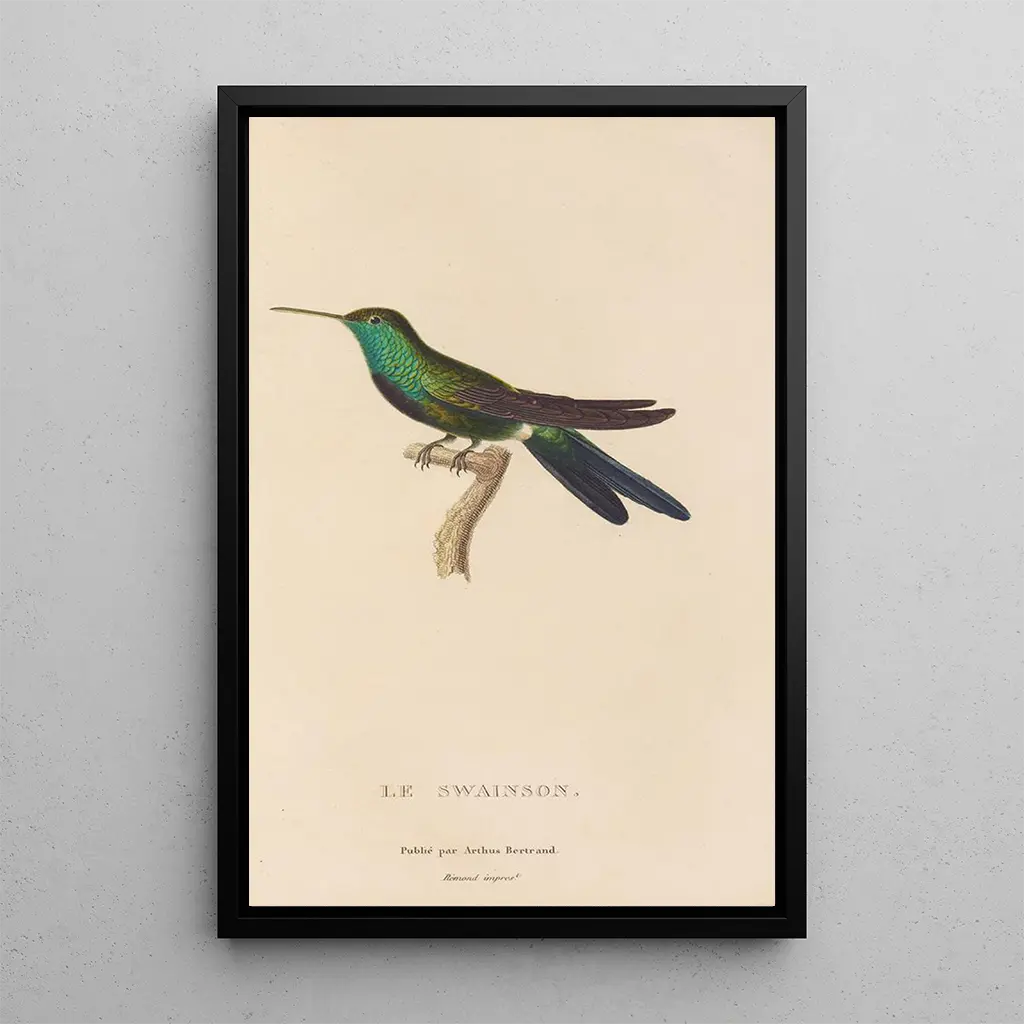 La taidegrafiikka Histoire naturelle des oiseaux-mouches Pl71 tarjoaa kiehtovan näkymän näihin herkkiin olentoihin. Elävät ja hohtavat höyhenvärit, jotka vaihtelevat kirkkaista vihreistä syviin sinisiin, vangitsevat katseen ja luovat keveyden ja arvokkuuden tunnelman. Lessonin käyttämä kaiverrustekniikka mahdollistaa jokaisen yksityiskohdan esittämisen poikkeuksellisella tarkkuudella, höyhenistä linnun hoikkaan muotoon. Tämä kangas kutsuu mietiskelyyn, kuljettaen katsojan maailmaan, jossa luonto paljastaa koko loistonsa.