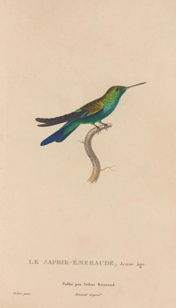 Ltaidegrafiikka "Histoire naturelle des oiseaux-mouches Pl51" René Primevère Lessonin teos kuljettaa meidät elinvoimaisiin maailmoihin, joissa luonto puhuu kirkkaasti. Tämä taidegrafiikka, täynnä värejä, esittelee monipuolisen valikoiman kolibreja, joista jokainen on kuvattu poikkeuksellisen tarkasti. Vaaleanpunaisen, oranssin ja vihreän kirkkaat sävyt kietoutuvat toisiinsa, luoden dynaamisen ja elävän ilmapiirin. Lessonin hallitsema akvarellitekniikka mahdollistaa näiden lintujen keveyden ja eleganssin välittämisen, lähes tuntuvasti. Jokainen yksityiskohta, höyhenistä asentoihin, on huolellisesti suunniteltu, kutsuen katsojan ihailuun ja ihmetykseen.