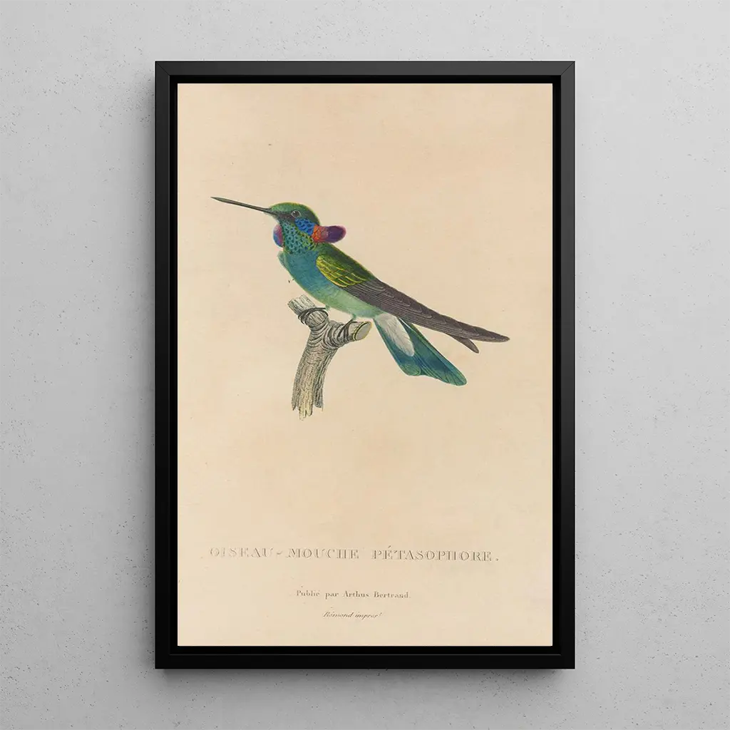 Taidegrafiikka Histoire naturelle des oiseaux-mouches Pl01 on todellinen ylistys lintujen kauneudelle. Tässä teoksessa René Primevère Lesson tallentaa lintujen olemuksen poikkeuksellisen tarkasti. Elävät ja hohtavat värit, jotka vaihtelevat kirkkaista vihreistä loistaviin punaisiin, luovat elävän ja dynaamisen ilmapiirin. Vesiväritekniikka, jota käytetään hienovaraisesti, mahdollistaa näiden olentojen keveyden ja hienostuneisuuden välittämisen. Jokainen yksityiskohta, höyhenistä ja sulavista asennoista, kutsuu katsojan sukeltamaan maailmaan, jossa luonto paljastuu koko loistossaan.