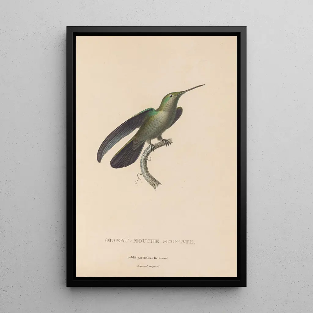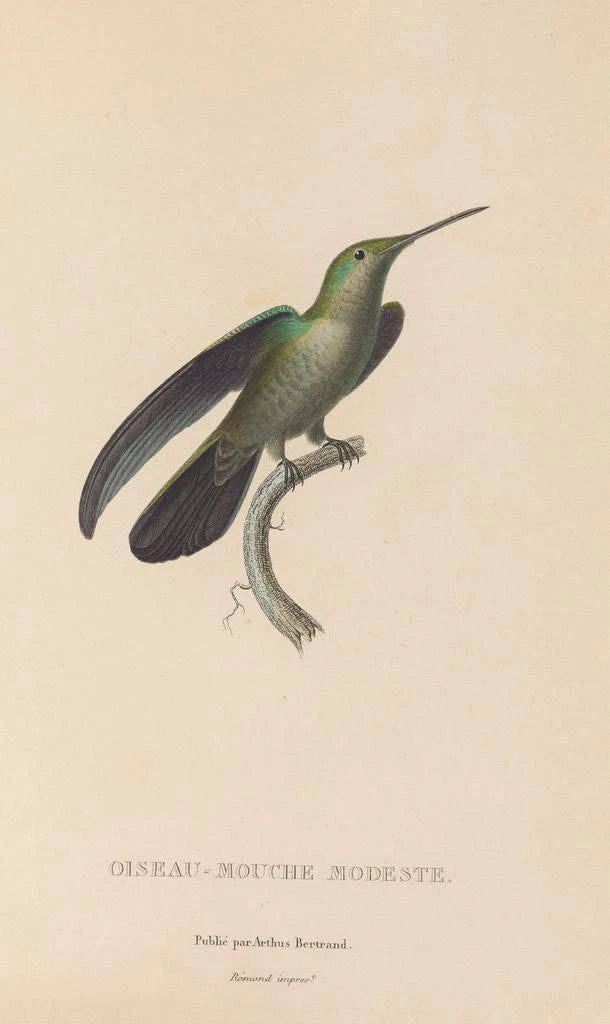 Histoire naturelle des oiseaux-mouches Pl33 : L L taidegrafiikka juhlistaa keveyttä ja kauneutta. Eläväiset ja hohtavat värit, jotka kuvaavat herkkää taidegrafiikkaa, tuntuvat melkein värisevän kankaalla. Jokainen yksityiskohta, höyhenistä heijastuksiin, on huolellisesti työstetty, luoden unenomaisen ja ihastuttavan ilmapiirin. Harmoninen koostumus kutsuu katsojan sukeltamaan näiden ilmassa liikkuvien olentojen kiehtovaan maailmaan, jossa luonto paljastaa koko loistonsa. Tämä teos on todellinen kunnianosoitus lintutieteelliselle monimuotoisuudelle, vangiten olennaisen elegantin linnunäkemyksen.