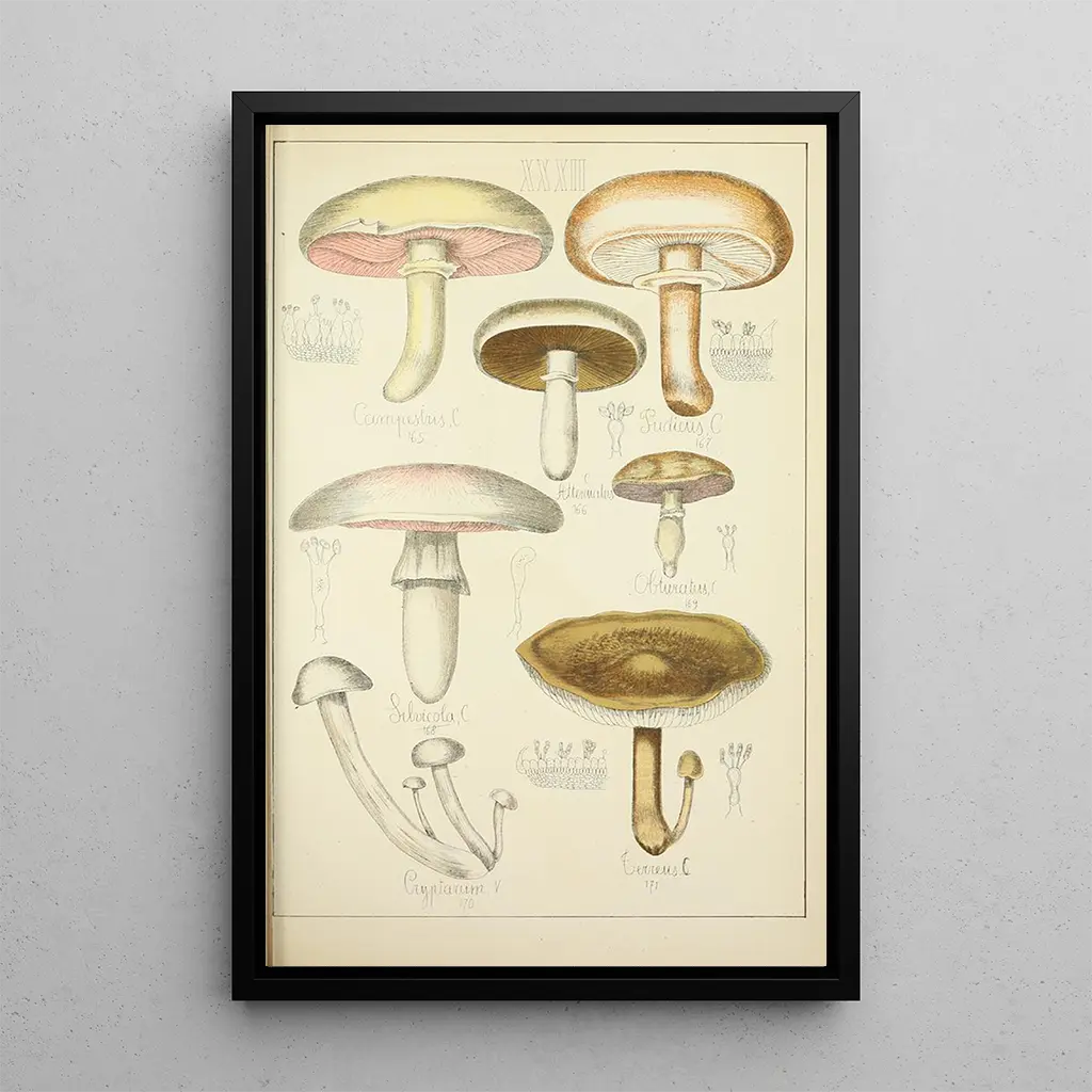 L'œuvre "Histoire naturelle des champignons Pl32" de Guillaume Sicard nous invite à découvrir la richesse et la diversité des champignons à travers une représentation minutieuse. Cette taidegrafiikka met en avant des espèces variées, chacune illustrée avec un souci du détail qui témoigne du talent de l'artiste. Les couleurs éclatantes et les textures délicates créent une atmosphère vivante, presque tactile, qui attire le regard et stimule l'imagination. En contemplant cette toile, on ressent une connexion profonde avec la nature et une admiration pour le monde souvent méconnu des champignons.