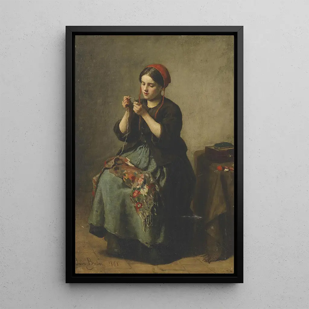 Tässä koskettavassa teoksessa Jules Breton kuvaa keskittynyttä maalaisnaista, joka pujottelee neulaa huolellisesti. Pehmeä valo, joka valaiseee kohtauksen, korostaa vaatteiden tekstuureja ja kasvojen yksityiskohtia, paljastaen aitouden kauneuden ja rauhallisen voiman. Pastellivärit, herkästi ja harmonisesti yhdistyneinä, luovat lämpimän ilmapiirin, joka kutsuu katsojan arvostamaan tämän hetken yksinkertaisuutta. Kompositio, keskittyen maalaisnaisen hahmoon, korostaa käsityön tärkeyttä ja päivittäisten tehtävien arvokkuutta, tehden tästä taidegrafiikasta todellisen kunnianosoituksen maaseudun elämälle.