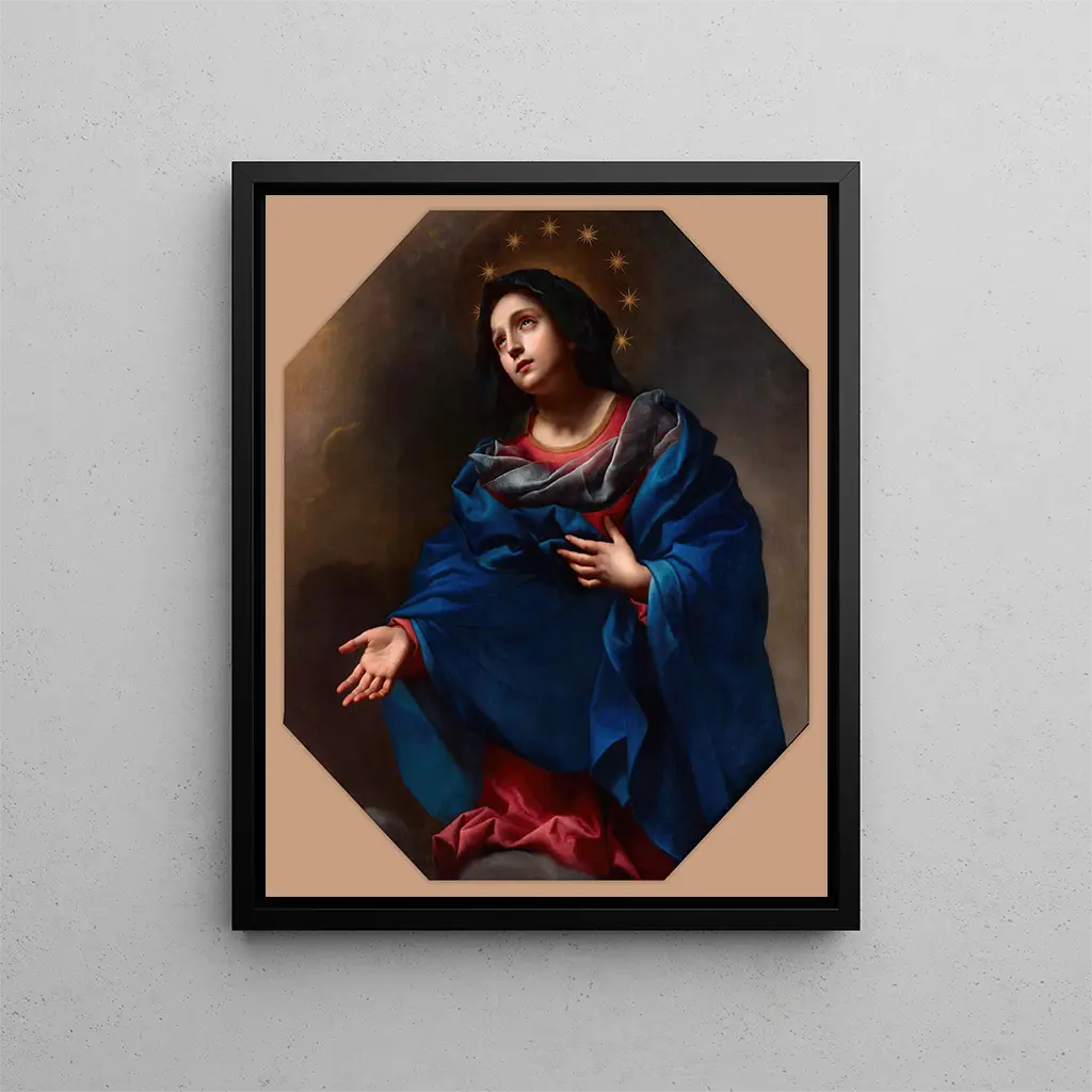 Barokin taiteen kiehtovassa maailmassa Carlo Dolcin "Madone en gloire" kohoaa ikonina, vangiten katseet ja herättäen sieluja. Tämä Neitsyt Marian esitys, ympäröity jumalallisella valolla, ylittää pelkän maalauksen ja muuttuu todelliseksi henkiseksi kokemukseksi. Taiteilija, mittaamattoman lahjakas, onnistuu vangitsemaan uskon ja hartauden ytimen, tarjoten katsojalle kutsun ihailla pyhän kauneutta. Tämän taidetulosteen kautta alkuperäisen teoksen taika paljastuu, antaen jokaiselle mahdollisuuden upota maailmaan, jossa taide ja henkisyys kietoutuvat harmonisesti yhteen.