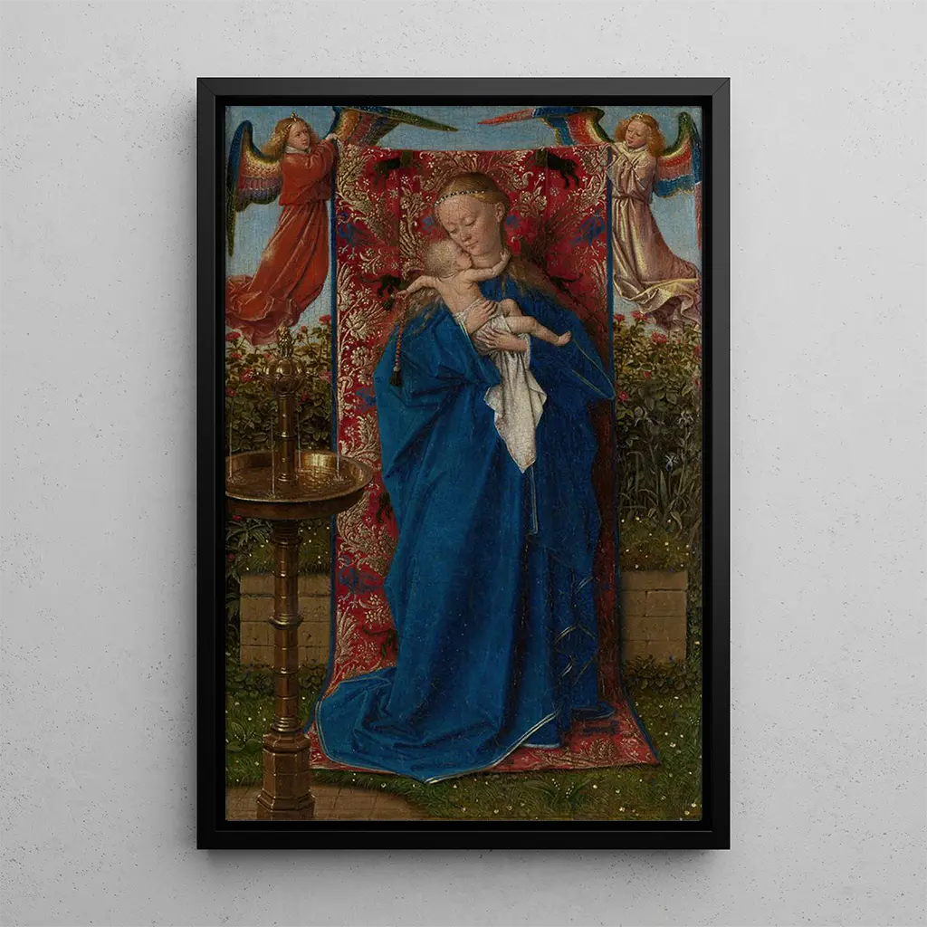 Jan van Eyckin "Madone à la fontaine" on teos, joka herättää jumalallisen äitiyden lempeyden ja rauhan. Tässä herkässä kohtauksessa Neitsyt Maria, ympärillään rehevää luontoa, vaikuttaa tarjoavan lämpimän suojan Vauva Jeesukselle. Pastellivärit ja hienostuneet yksityiskohdat luovat rauhallisen tunnelman, kun taas pehmeä valo korostaa hahmojen hienovaraisia piirteitä. Fontaani, elämän ja puhdistuksen symboli, lisää tähän esitykseen henkisen ulottuvuuden, kutsuen katsojan syvälliseen pohdintaan äidin ja lapsen välisestä suhteesta.