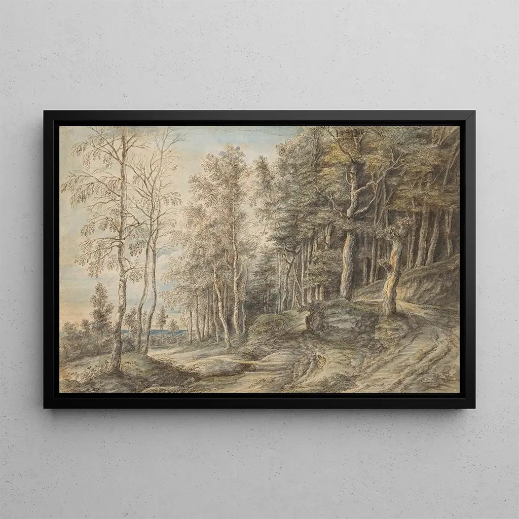 Le "Paysage forestier" nous plonge dans un univers de verdure luxuriante, où la lumière filtre à travers le feuillage dense. Les nuances de vert, allant des teintes les plus sombres aux éclats lumineux, créent une atmosphère paisible et sereine. La technique de Lucas van Uden, qui utilise des coups de pinceau délicats, permet de rendre la texture des arbres et des sous-bois avec une grande finesse. Ce tableau évoque une sensation de calme et de refuge, invitant le spectateur à se perdre dans cette nature foisonnante et accueillante.