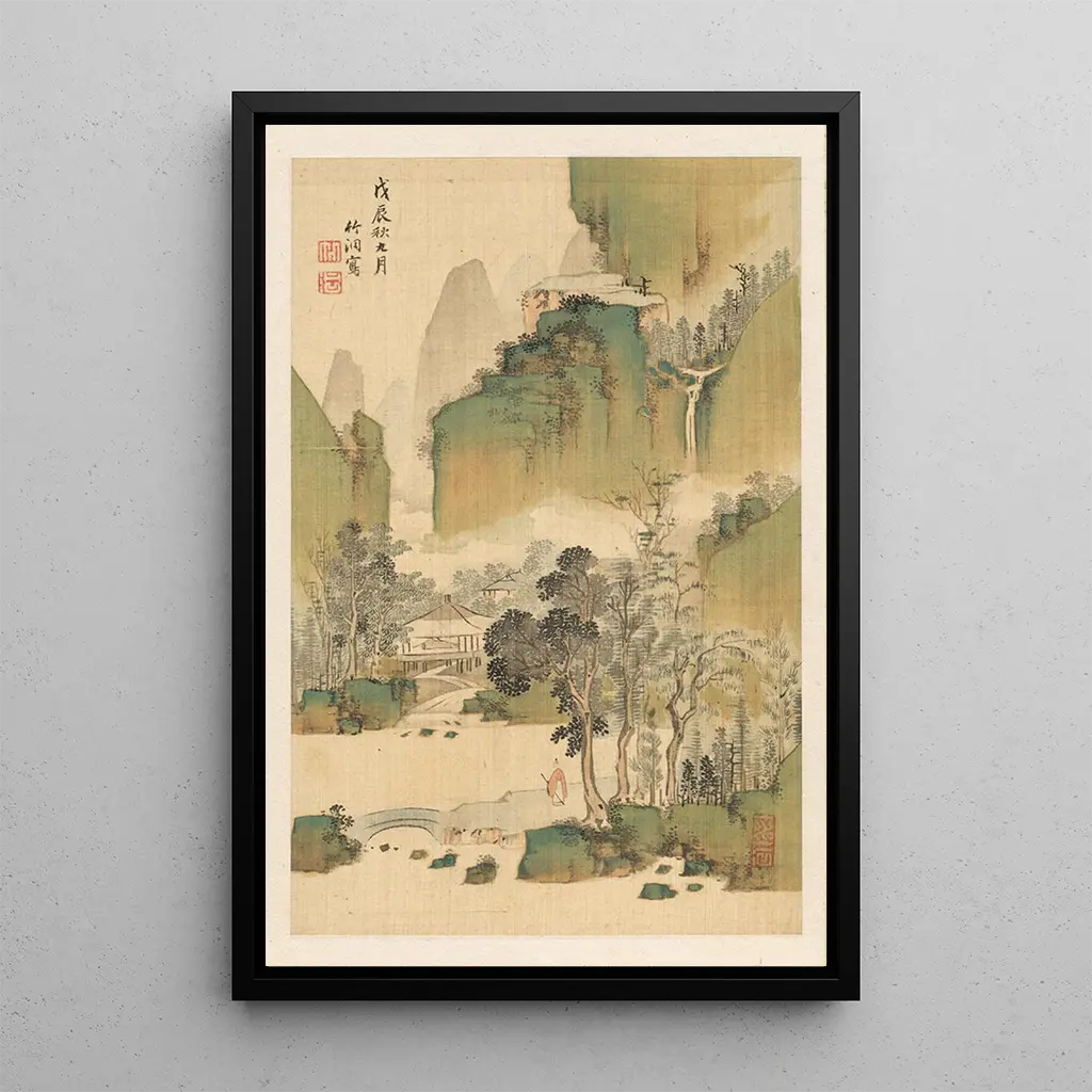Tässä taidegrafiikka-versiossa "Paysage" -maalauksesta Nakabayashi Chikutō kuljettaa meidät maailmaan, jossa luonto kukoistaa kaikessa loistossaan. Pehmeät ja rauhoittavat värit, jotka vaihtelevat rehevistä vihreistä taivaan sinisiin, luovat rauhallisen tunnelman. Taiteilijan tekniikka, joka on luonteeltaan hienovaraisia siveltimen vetoja, herättää eloon jokaisen maiseman elementin, majesteettisista puista mutkikkaisiin jokiin. Tämä taidegrafiikka kutsuu mietiskelyyn, jossa melkein voi kuulla tuulen huminan ja lintujen laulun, tehden tästä teoksesta todellisen keitaan mielen rauhalle.