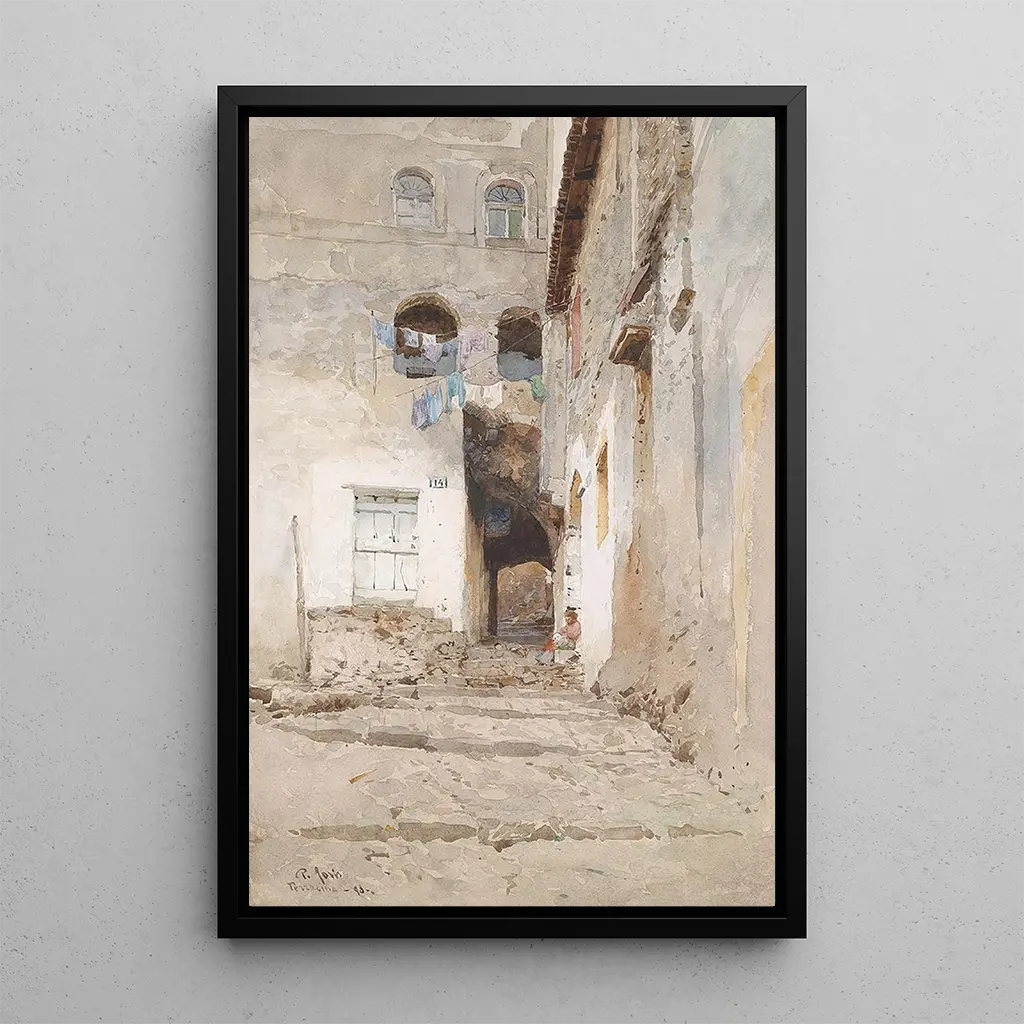 Maisons à Terracina : kunnioitus italialaiselle kauneudelle "Maisons à Terracina" on taidegrafiikka, joka herättää italian maisemien rauhallisuuden ja kauneuden. Kanvaasi kuvaa värikkäitä taloja, jotka kylpevät auringon kultaisessa valossa ja kohoavat ylpeinä kirkkaan sinisen taivaan vasten. Okerin ja terrakotan lämpimät sävyt sulautuvat harmonisesti, luoden vastaanottavaisen ja rauhallisen tunnelman. Pio Jorisin tekniikka, joka on luonteeltaan ekspressiivisiä siveltimen vetoja ja tarkkaa yksityiskohtien huomioimista, herättää tämän kuvauksen eloon. Jokainen elementti kompositiossa kutsuu katsojan seikkailulle tähän viehättävään rannikkokaupunkiin. Pio Joris : 1900-luvun alun taiteilija Pio Joris, 1900-luvun alun italialainen taiteilija, tunnetaan elävistä maisemistaan ja arkipäivän kohtauksistaan. Hän on vaikutteita saanut impressionismin liikkeestä, ja hän vangitsee valon ja värien ainutlaatuisella herkkyydellä. Hänen teoksensa, jotka usein inspiroituvat luonnon ja italialaisen arkkitehtuurin kauneudesta, kertovat syvästä kiintymyksestä kotimaahansa. "Maisons à Terracina" kuvaa täydellisesti tätä intohimoa, heijastaen ihmisen ja ympäristön välistä harmoniaa. Joris on onnistunut ikuistamaan yksinkertaisia hetkiä, mutta täynnä tunnetta, tehden hänestä merkittävän taiteilijan aikakaudellaan. Monipuolinen sisustustarjonta Taidegrafiikan "Maisons à Terracina" reproduktio on koristeellinen kappale, joka tuo aitouden tuntua sisätiloihisi. Olipa kyseessä olohuone, ruokasali tai toimisto, tämä kanvaasi herättää italian maisemien kauneuden ja kutsuu unelmoimaan. Sen poikkeuksellisen laadukas tulostus ja uskollisuus alkuperäiselle teokselle takaavat vaikuttavan visuaalisen lopputuloksen. Sisällyttämällä tämän teoksen sisustukseesi luot lämpimän ja inspiroivan tilan, samalla juhlistaen italialaista taidetta ja kulttuuria. Tämä kanvaasi on täydellinen valinta taiteen ystäville ja matkailun harrastajille.