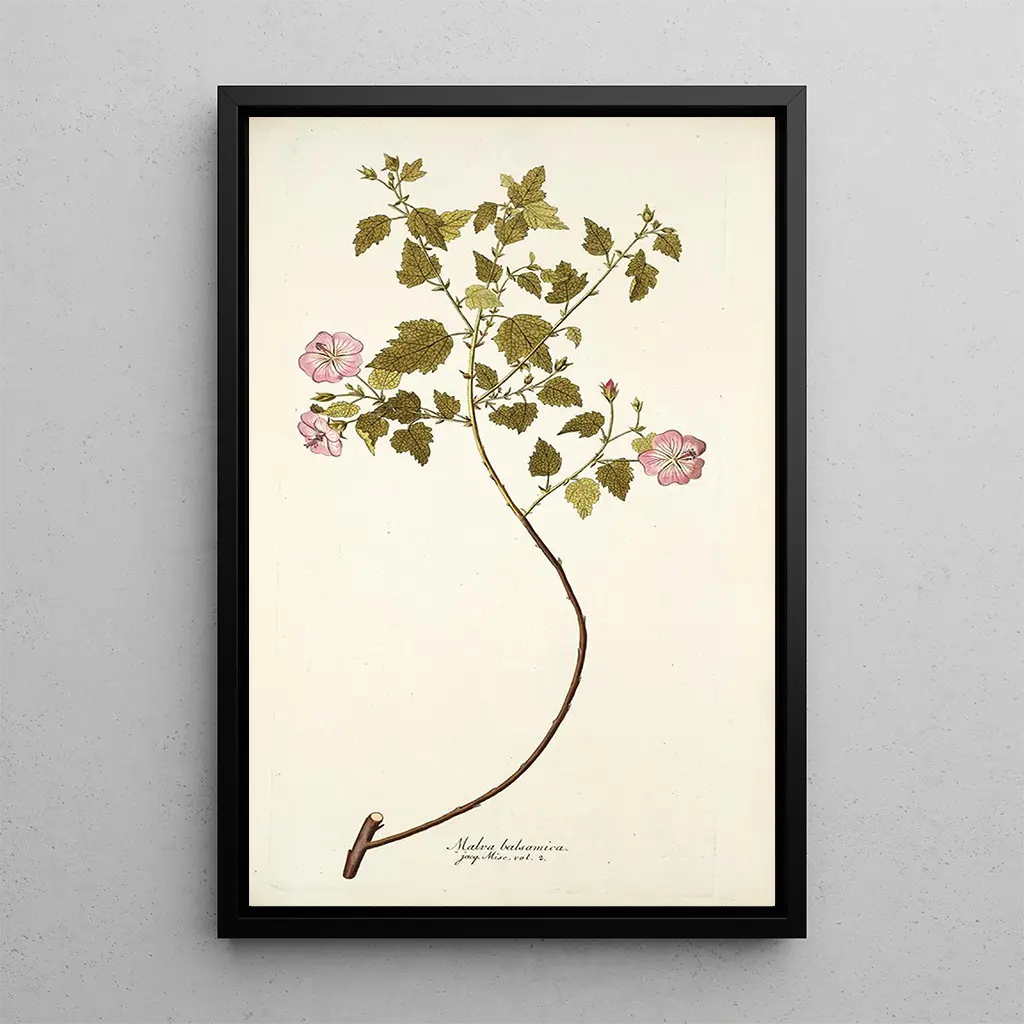 L taidegrafiikka Malva balsamica, Nikolaus Joseph Freiherr von Jacquinin teos, johdattaa meidät pehmeyden ja tarkkuuden maailmaan. Tämä taidegrafiikka, joka on täynnä yksityiskohtia, korostaa kasvin kauneutta pastellisävyillä, jotka herättävät rauhan tunteen. Vihreän ja vaaleanpunaisen sävyt sekoittuvat harmonisesti, luoden rauhoittavan ilmapiirin. Vesiväritekniikka, jota on käytetty mestarillisesti, mahdollistaa petalien läpinäkyvyyden ja lehtien tekstuurin esittämisen, tarjoten todellisen kutsun luonnon tarkasteluun. Jokainen elementti on huolellisesti esitetty, osoittaen tarkkaavaista ja kunnioittavaa katsetta kasvi-maailmaa kohtaan.