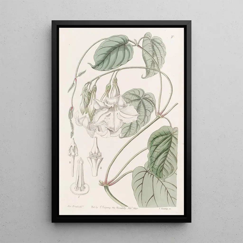 Taidegrafiikka Mandevilla douce -kukka on sukellus lempeyden ja keveyden maailmaan. Sen hennon vaaleanpunaiset terälehdet, lähes pastelliset, herättävät kuvan hetkellisestä kukkien kauneudesta kukinnan aikana. Hienovaraiset sävyt sulautuvat harmonisesti, luoden rauhoittavan ja romanttisen ilmapiirin. Akvarellitekniikka, jota käyttää Sydenham Edwards, mahdollistaa kukkien läpinäkyvyyden ja kirkkauden vangitsemisen, tuoden eloa tähän teokseen. Jokainen yksityiskohta on huolellisesti toteutettu, lehtien suonista terälehtien kaariin, kutsuen katsojan tarkkailevaan pohdintaan.