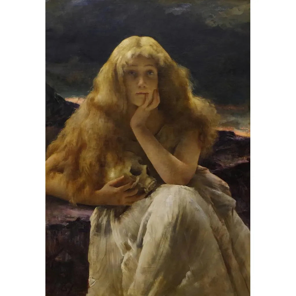 Marie Madeleine d'Alfred Stevensin taidegrafiikka vangitsee syvällisten tunteiden vallassa olevan naisen olemuksen. Herkkä sommittelu korostaa hänen kasvojensa kauneutta, joka on valaistu pehmeällä valolla, korostaen hänen piirteitään. Lämmintä värimaailmaa, jossa yhdistyvät punaisen ja kullan sävyt, luo intiimin ja pohdiskelevan tunnelman. Stevensin tekniikka, joka yhdistää realismia ja romantiikkaa, mahdollistaa Marie Madeleine -hengen syvyyden kokemisen, samalla herättäen tietynlaista melankoliaa. Tämä taulu, todellinen kunnianosoitus feminiinisyydelle, kutsuu pohtimaan ihmisluontoa ja pelastuksen etsintää.
