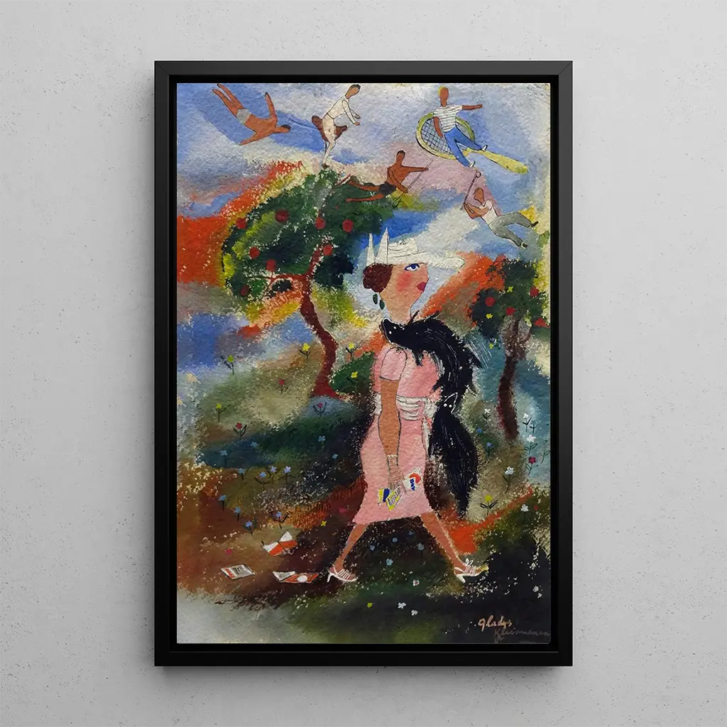 Lteos "Matkalla Bermudalle" Gladys Kleinmanilta kuvaa lumoavaa matkaa värikkäiden maisemien halki. Värien loisto, joka ulottuu syvänsinisistä meristä reheviin saarenvihreisiin sävyihin, luo rauhan ja pakoon vievän tunnelman. Kleinmanin tekniikka, joka yhdistää vesiväriä ja öljyvärejä, herättää eloon jokaisen yksityiskohdan, pilvistä kimaltaviin heijastuksiin vedessä. Tämä kangas kutsuu katsojan uppoutumaan luonnonkauneuden maailmaan, jossa aika tuntuu pysähtyneen ja jokainen sivellin veto kertoo seikkailun ja löytämisen tarinan.