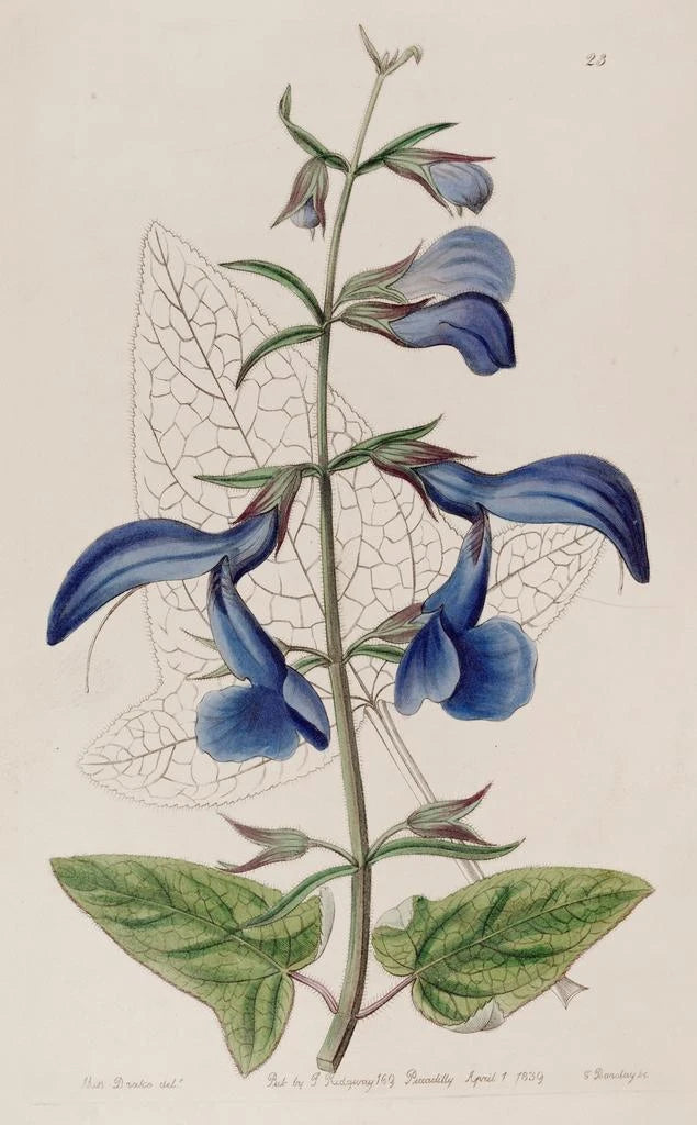 Sydenham Edwards, joka toimi 1800-luvun alussa, tunnetaan yhtenä aikansa merkittävimmistä kasvitieteellisistä kuvittajista. Hänen työnsä oli vahvasti romanttisen liikkeen vaikutuksen alainen, joka arvosti luontoa ja taiteellista ilmaisua. Edwards teki yhteistyötä arvostettujen kasvitieteilijöiden kanssa, mikä mahdollisti harvinaisten ja eksoottisten lajien, kuten mexikolaisessa salvian taidegrafiikassa, dokumentoinnin. Hänen huolellinen lähestymistapansa ja yksityiskohtien huomioiminen tekivät hänestä keskeisen hahmon kasvitieteellisessä kuvittamisessa, edistäen kasvien tuntemusta ja arvostusta maailmanlaajuisesti.