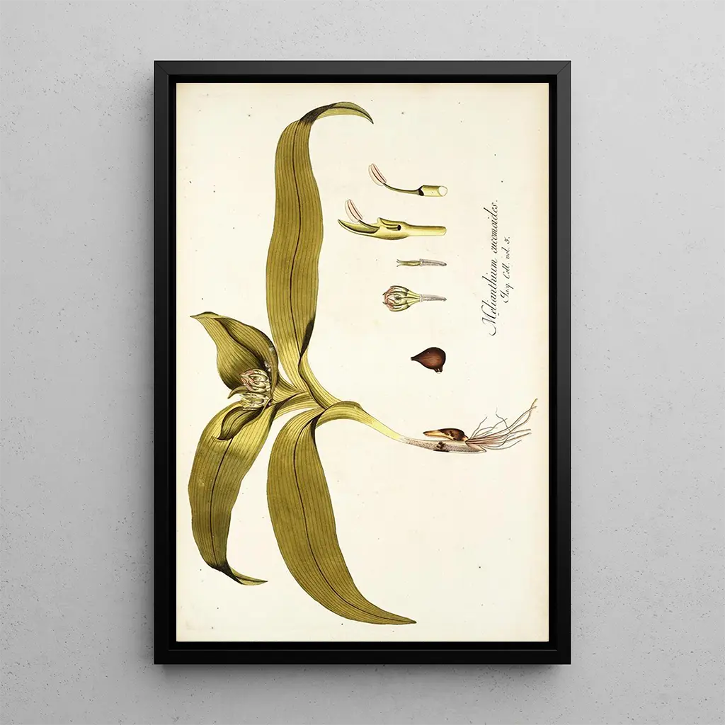 Melanthium eucomoides -taidegrafiikan reproduktio, jonka on tehnyt Nikolaus Joseph Freiherr von Jacquin, paljastaa suurella eleganssilla kukkivan koostumuksen. Terävien terälehtien yksityiskohdat, yhdistettynä rikkaan väripalettiin, luovat kiehtovan teoksen, joka vangitsee katseen. Vihreän ja valkoisen sävyt, korostettuina violeteilla kosketuksilla, viittaavat tämän kasvin hienostuneisuuteen. Jacquinin hallitsema akvarellitekniikka mahdollistaa kukkien tekstuurin esittämisen keveydellä, joka tuntuu lähes kosketeltavalta, kutsuen visuaaliseen luonnon tutkimiseen.