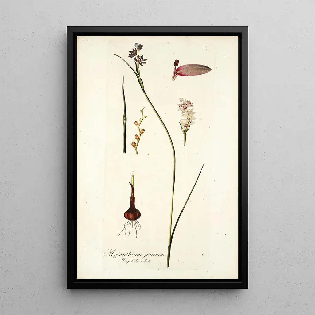 Melanthium junceumin taidegrafiikka viedä meidät rikkaaseen ja herkkään kasvitieteelliseen maailmaan. Vihreät ja keltaiset sävyt kietoutuvat harmonisesti yhteen, viitaten metsänalusten raikkauteen. Vesiväritekniikka, jota käyttää Nikolaus Joseph Freiherr von Jacquin, antaa tälle teokselle keveyttä ja läpinäkyvyyttä, jotka vangitsevat katseen. Jokainen yksityiskohta terälehdistä ja lehdistä on huolellisesti toteutettu, luoden rauhallisen ja ihmettelevän ilmapiirin luonnon kauneuden edessä. Tämä taulu, todellinen ylistys kasvistolle, kutsuu rauhalliseen ja inspiroivaan pohdintaan.