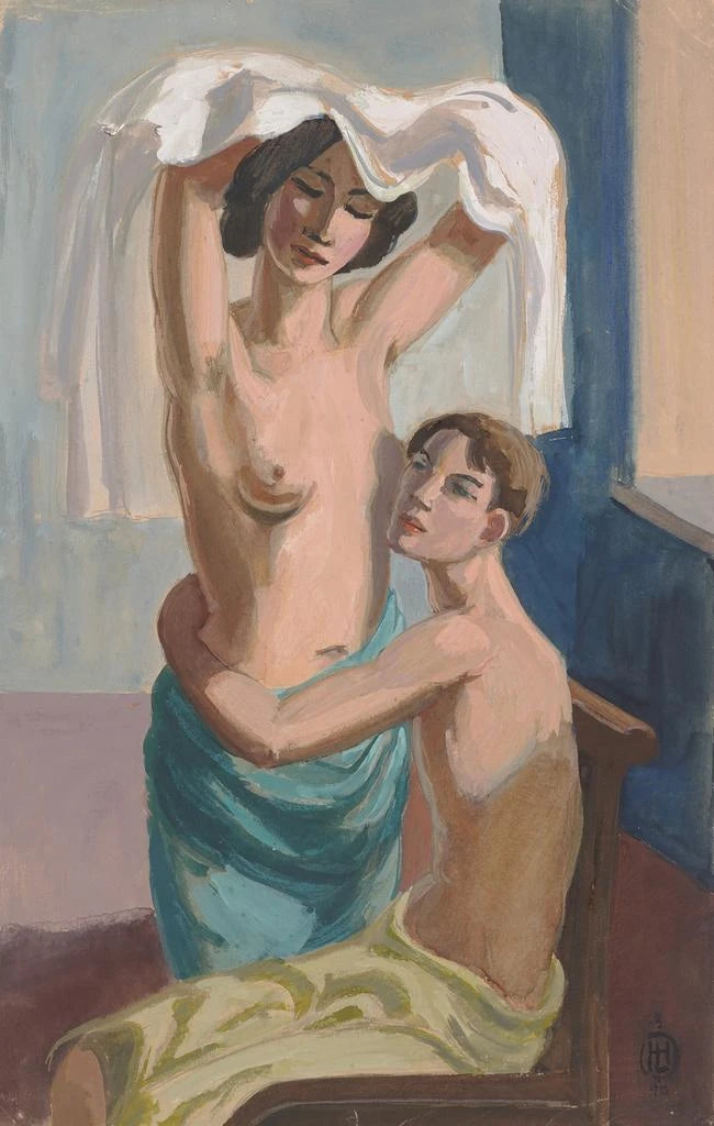 La taidegrafiikkaa de l'œuvre Homme nu assis étreignant une femme nue debout offre une vision saisissante de l'intimité et de la connexion humaine. Hermann Lismann, à travers des formes délicates et des lignes fluides, parvient à capturer l'essence de la vulnérabilité et de la passion. Les nuances de peau, subtilement rendues, créent un contraste avec le fond, mettant en valeur la beauté des corps nus. Cette œuvre évoque une atmosphère de tendresse et d'harmonie, invitant le spectateur à réfléchir sur la nature des relations humaines et l'esthétique du corps.