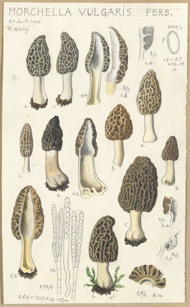 Morchella vulgaris -taidegrafiikka Hans Baldungilta kutsuu meitä löytämään sienien kiehtovan kauneuden. Tämä teos erottuu lämpimillä ja maamaisilla sävyillään, jotka viittaavat elinvoimaisiin metsänalaisiin. Baldungin tekniikka, yhdistäen tarkkuutta ja ilmaisukykyä, luo elävän ja dynaamisen ilmapiirin. Sienien yksityiskohtaiset muodot ja erilaiset tekstuurit vangitsevat luonnon ytimen, muistuttaen meitä luonnon monimuotoisuudesta ja maailman monimutkaisuudesta, joka ympäröi meitä.