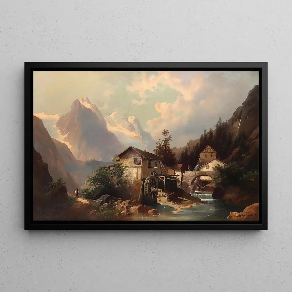 Josef Thoma, actif à la fin du XIXe siècle et au début du XXe siècle, est un peintre dont le travail est profondément ancré dans les paysages des Alpes. Influencé par le mouvement romantique, il a su retranscrire la beauté sauvage et la majesté des montagnes à travers ses œuvres. Thoma a souvent exploré des thèmes liés à la vie rurale, mettant en avant la relation entre l'homme et son environnement. Ses tableaux, tels que cette reproduction de Moulin dans la montagne, sont des témoignages précieux de l'importance de la nature dans la culture alpine et de la façon dont elle inspire l'art.