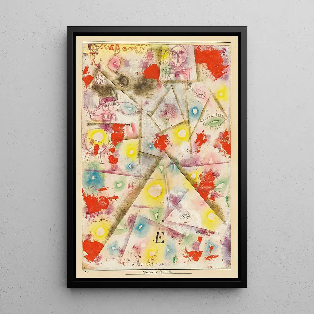 Paul Klee, syntynyt vuonna 1879 Sveitsissä, on yksi 1900-luvun vaikutusvaltaisimmista taiteilijoista. Bauhaus-ryhmän jäsenenä hän yhdisti taiteen ja opetuksen, vaikuttaen moniin nykytaiteilijoihin. Hänen ainutlaatuinen tyylinsä, joka yhdistää abstraktion ja figuurin, saa vaikutteita matkoilta, musiikista ja luonnosta. Klee oli syvästi vaikuttunut surrealismista ja ekspressionismista, mikä näkyy hänen teoksissaan, joissa mielikuvitus vie voiton todellisuudesta. "Feuille Commémorative E" heijastaa tätä viattomuuden ja taikuuden etsintää, jotka ovat hänen työnsä tunnuspiirteitä, samalla kun se sijoittuu aikaan, jolloin taide pyrki vapautumaan perinteisistä säännöistä.