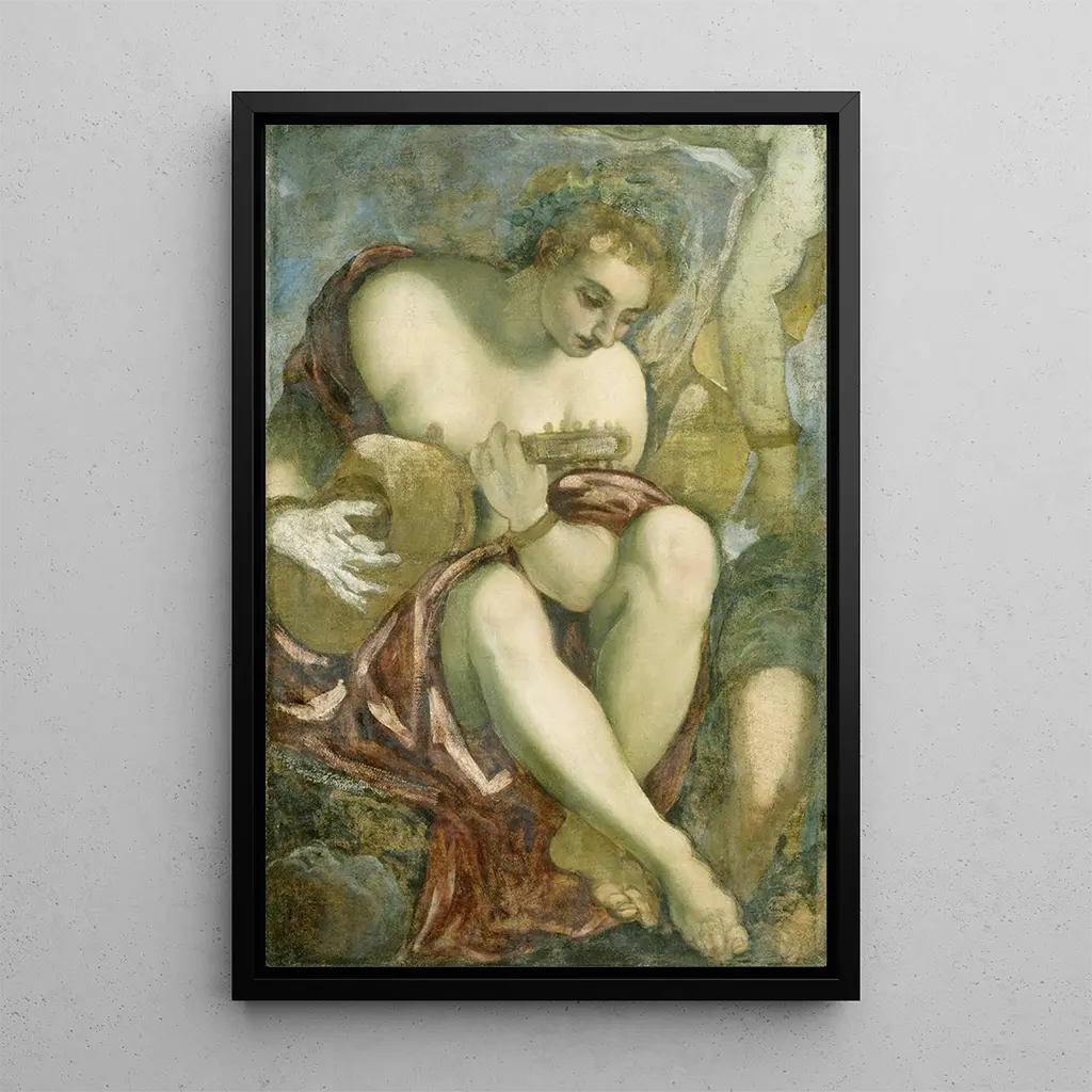 Jacopo Tintoretto, born in 1518 in Venice, is one of the most influential artists of the Renaissance. His style, marked by bold use of light and movement, revolutionized painting of his time. Influenced by Michelangelo and Titian, Tintoretto developed a unique approach that blends realism with dramatization. His works, often filled with emotion, reflect the spiritual and social concerns of his era. As a key member of the Venetian school, he left a lasting legacy, inspiring generations of artists across Europe. The depiction of the Muse with a lute demonstrates his skill in capturing the essence of human creativity.
