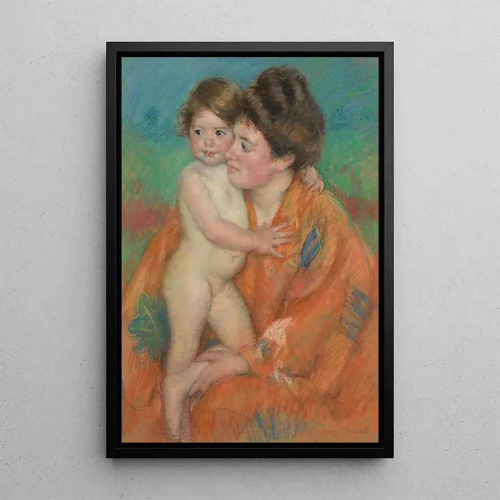 Tässä koskettavassa teoksessa Mary Cassatt kuvaa äidin ja hänen lapsensa lämpimän läheisyyden ja yhteyden hetkessä. Lämmintä tunnelmaa luovat vaaleanpunaisen ja keltaisen sävyt, jotka luovat kodikkaan ja intiimin ilmapiirin. Cassattin tekniikka, joka on tunnusomaista hienovaraisille siveltimenvedoille ja ilmeiden huolelliselle tarkastelulle, tekee näkyväksi rakkauden ja suojelun, jonka äiti tuntee lastaan kohtaan. Tämä teos, sekä yksinkertainen että syvällinen, kutsuu katsojan kokemaan perheen sidoksen puhtaan tunteen, tallentaen äitiyden olemuksen.