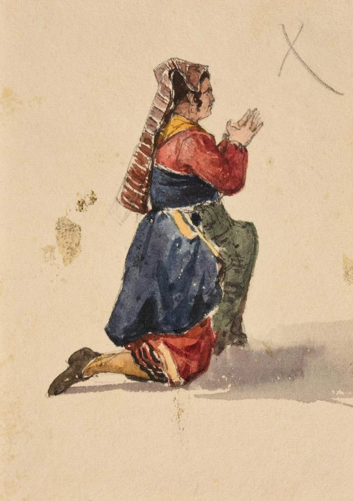 L'œuvre "Étude de femme agenouillée" de Jacques-Raymond Brascassat dépeint une figure féminine dans une pose empreinte de douceur et de sérénité. Les courbes délicates et les détails minutieux de la robe mettent en avant la beauté et la fragilité de la féminité. La palette de couleurs choisie par l'artiste, avec des tons chauds et apaisants, crée une atmosphère intime et contemplative. Cette toile invite à une réflexion sur la condition féminine, tout en célébrant la grâce et l'élégance de son sujet, capturant un moment de vulnérabilité et de force.