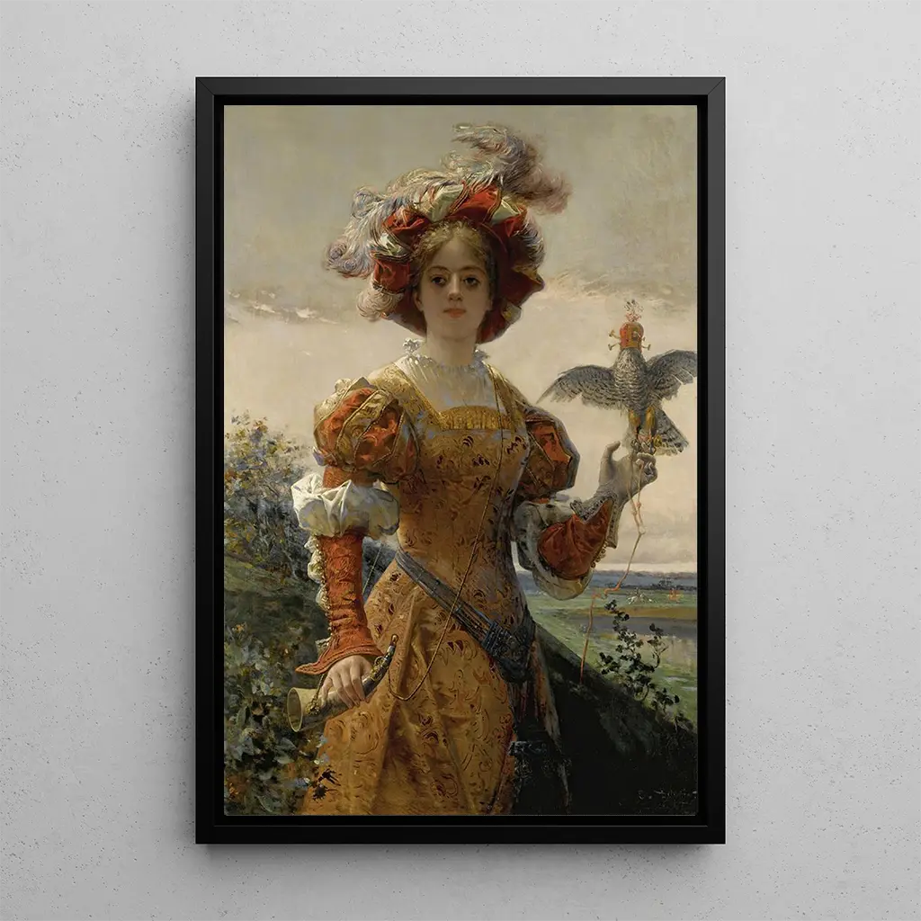 La taidegrafiikka de la toile "Dame au faucon" d'Edmond-Louis Dupain nous plonge dans un univers de raffinement et de délicatesse. Ce tableau, riche en détails, met en avant une femme élégante vêtue d'une robe somptueuse, tenant un faucon majestueux sur son poing. Les couleurs chaudes et les nuances de doré créent une atmosphère à la fois intime et majestueuse. La technique de Dupain, alliant réalisme et romantisme, donne vie à ce portrait, où chaque élément, du tissu de la robe aux plumes de l'oiseau, est traité avec une précision remarquable. Ce tableau invite à une contemplation profonde, révélant les émotions et le caractère de son sujet.