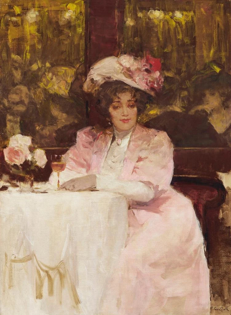 Tässä taidegrafiikan reproduktiossa "Dame kahvilassa" Victor Guerrier tallentaa hetkellisen arkipäivän elämän. Kompositio, hienostunut ja elegantti, korostaa istuvaa naista, joka on syventynyt ajatuksiinsa, ympäröivän lämpimän sisustuksen keskellä. Pehmeät värit, jotka sekoittavat beigen ja ruskean sävyjä, luovat intiimin, melkein nostalgisen tunnelman. Guerrierin tekniikka, joka yhdistää realismia ja impressionismia, mahdollistaa kohtauksen tunteen kokemisen, kutsuen katsojan uppoutumaan tähän pysähtyneeseen hetkeen.