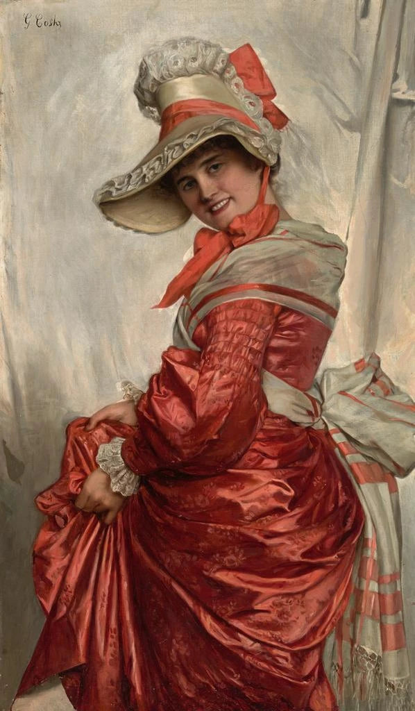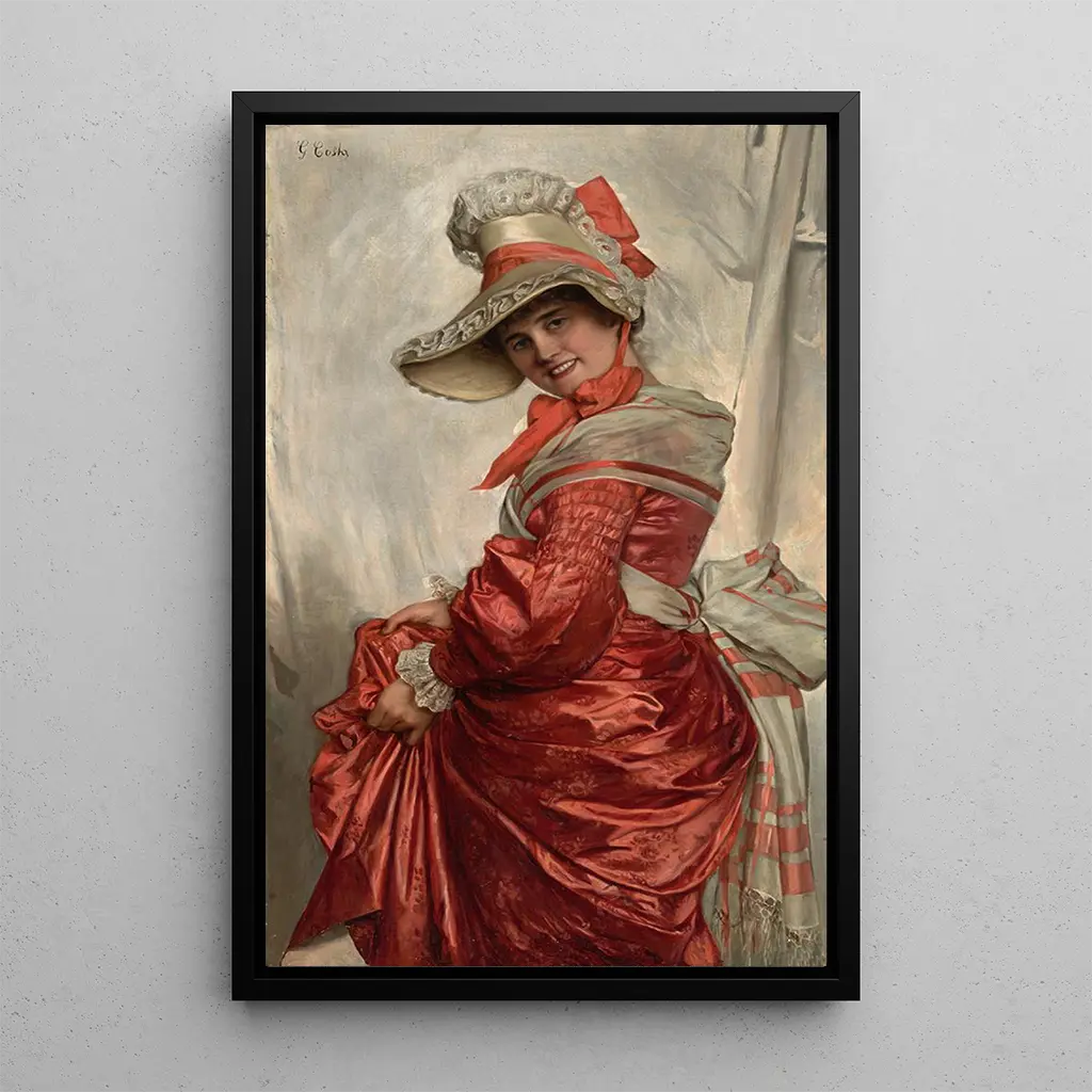 Tässä kiehtovassa teoksessa Giovanni Costa johdattaa meidät maailmaan, jossa arkuus ja eleganssi kohtaavat. Kompositio korostaa naista, joka on pukeutunut upeaan pukuun, jonka säihkyvät värit viittaavat aurinkoisen iltapäivän valoon. Puvun ja asusteiden yksityiskohtien tarkkuus lisää pinnan kosketusvaikutelmaa. Tunnelma on täynnä rauhaa, kutsuen katsojan ihailemaan ajattomasti kaunista muotia ja naisellisuutta. Jokainen sivellinvedos tuntuu kertovan tarinan, juhlistaen elämän taidetta 1800-luvun lopulla.