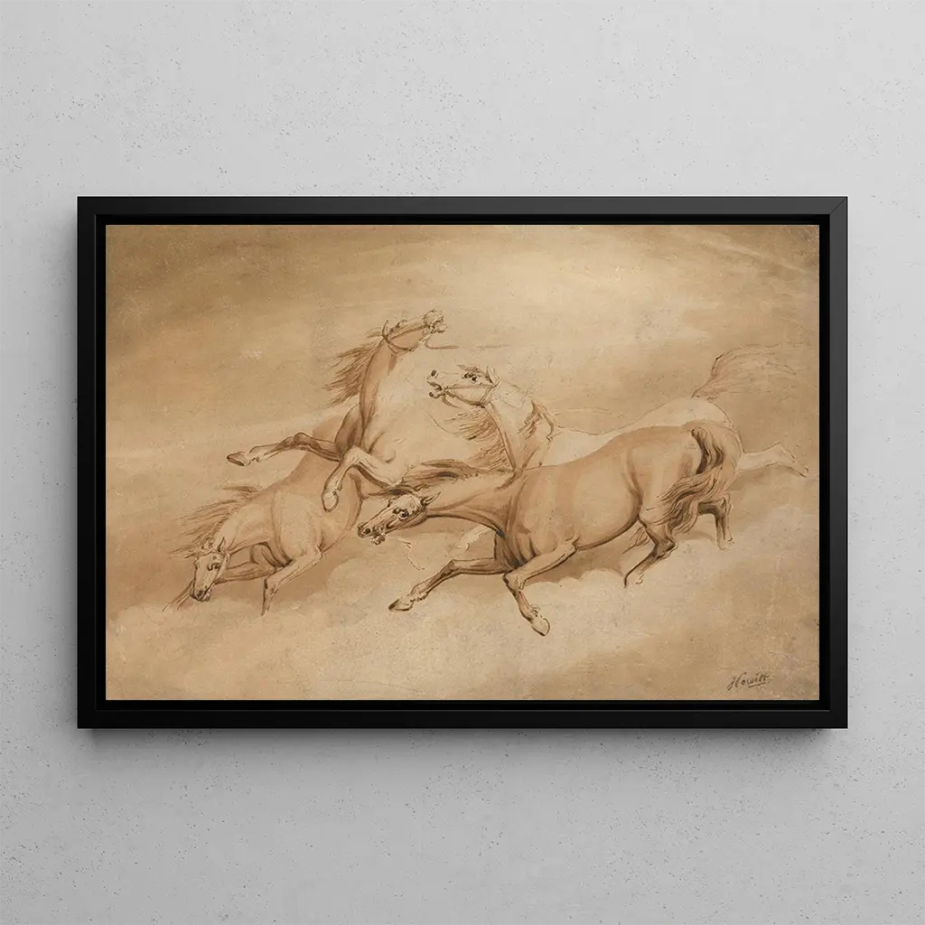 Dans cette œuvre emblématique, Quatre Chevaux au Galop, Samuel Howitt capture la puissance et la grâce de ces animaux majestueux. Les chevaux, représentés dans un mouvement dynamique, semblent presque s'élever au-dessus du sol, leurs muscles tendus et leur crinière au vent. La palette de couleurs, dominée par des bruns chauds et des touches de blanc éclatant, crée une atmosphère vibrante et vivante. La technique de l'artiste, mêlant aquarelle et dessin, donne une impression de légèreté et de fluidité, transportant le spectateur dans un monde où la nature règne en maître.