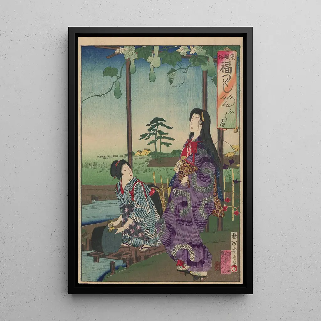 "Albumi Nishikie Pl19" Toyohara Chikanobu:lta on teos, joka kuvaa perinteisen japanilaisen elämän ohikiitävää kauneutta. Tämä taidegrafiikka erottuu kirkkaiden värien ja hienostuneiden kuvioiden ansiosta, jotka ovat tyypillisiä ukiyo-e-kiiltokuville. Chikanobu hallitsee arjen hetkien vangitsemisen taiteen, jossa hahmot, usein ympäröityinä lumoavilla maisemilla, vaikuttavat kukoistavan rauhallisuuden ilmapiirissä. Jokainen yksityiskohta, kuten koristellut vaatteet ja kukkivat taustat, luo runollisen ja nostalgisen tunnelman, kutsuen katsojan uppoutumaan hetkellisen kauneuden maailmaan.