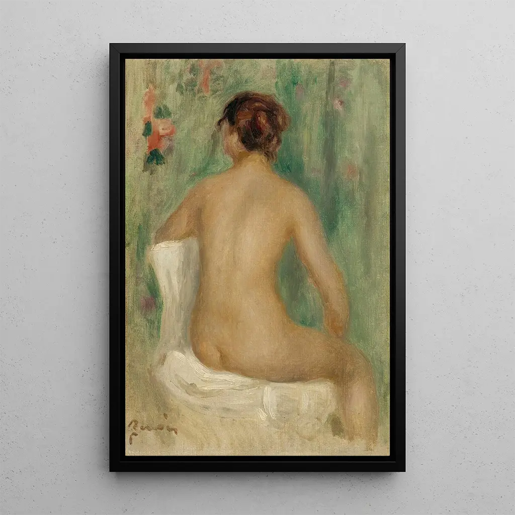 Tässä kiehtovassa teoksessa Pierre-Auguste Renoir johdattaa meidät naisen intiimiin maailmaan, istuessaan selkä päin. Hänen kehon hienovaraiset kaaret, pehmeän ja lämpimän valon valaisemina, luovat rauhan ja pohdinnan tunnelman. Väritasapaino, jossa yhdistyvät lämpimät sävyt ja pastellivärit, luo harmonisen kokonaisuuden, joka houkuttelee katsojan huomion. Renoirin impressionistinen tekniikka, sen sulavat siveltimenvedot ja kyky vangita valoa, herättää tämän kohtauksen eloon, tehden ympäröivän ilman lempeyden lähes tuntuvaksi. Tämä taidegrafiikka, todellinen pohdinnan kutsu, muistuttaa elämän ohikiitävästä kauneudesta.