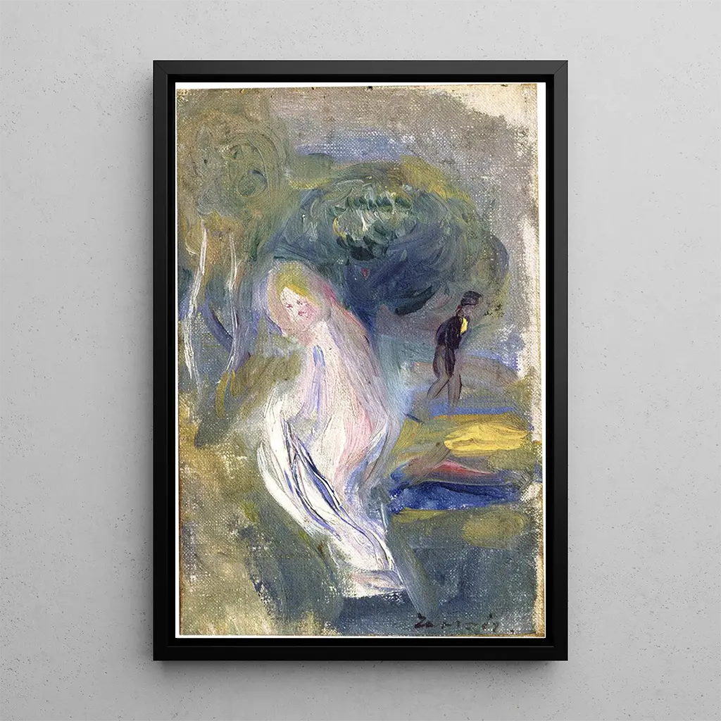 Tässä kiehtovassa teoksessa Pierre-Auguste Renoir johdattaa meidät maailmaan, jossa ihmisen kehon kauneus sekoittuu intiimin kohtauksen hienostuneisuuteen. Paljain muodon muodokkaat kaaret, pehmeästi valaisevat, luovat rauhan ja sensuaalisuuden tunnelman. Lämmintä väriä, liha- ja kultaisiin sävyihin, luovat visuaalisen harmonian, joka vetää katseen puoleensa. Taustalla oleva, hienovaraisesti hahmoteltu figuuri lisää teoksen narratiivista ulottuvuutta, vahvistaen ajatusta jaetusta intiimiydestä. Tämä kangas, todellinen impressionistinen mestariteos, kutsuu mietiskelyyn ja pakomatkaan.