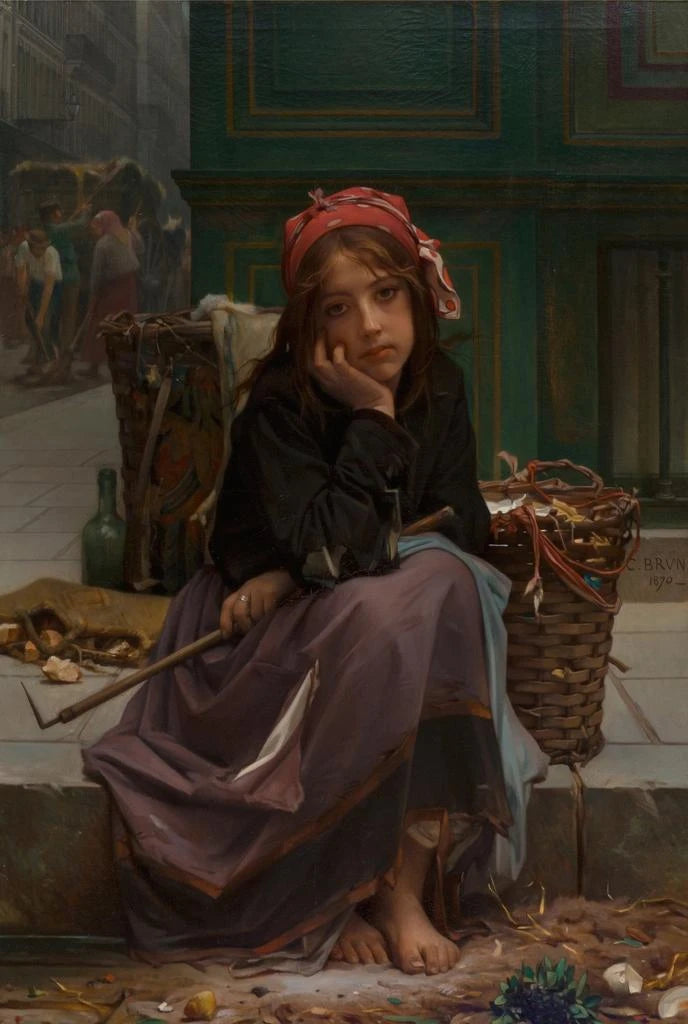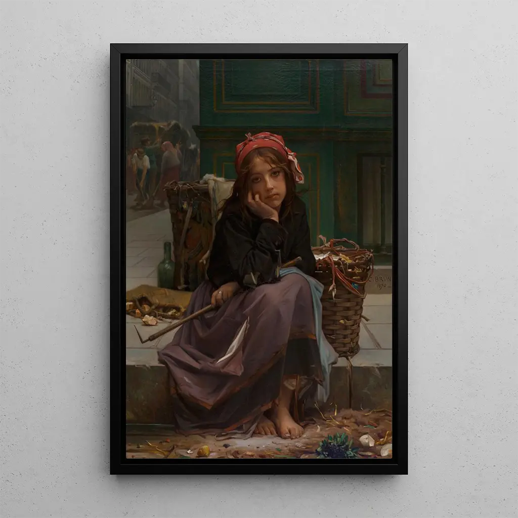 Guillaume Charles Brun, figure emblématique du XIXe siècle, s'inscrit dans la lignée des artistes réalistes qui cherchent à représenter la vie telle qu'elle est. Influencé par les transformations sociales et économiques de son temps, il s'intéresse particulièrement aux classes populaires et à leurs luttes. Ses œuvres, dont "Le jeune vendeur de chiffons", reflètent une profonde humanité et une volonté de donner une voix à ceux qui sont souvent invisibles. Par son art, Brun contribue à une prise de conscience sociale, faisant de lui un acteur important de son époque.