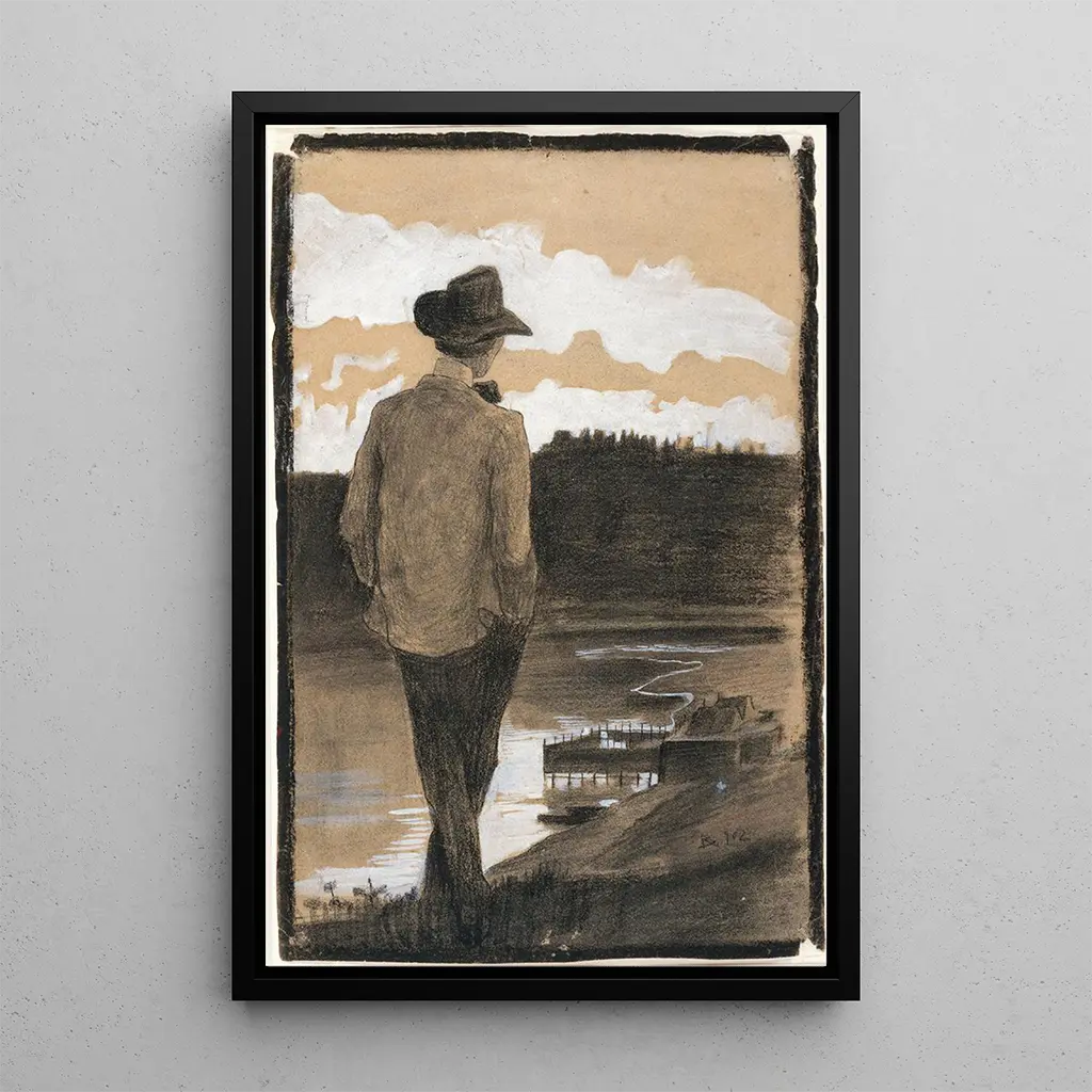 Taidegrafiikka Jeune Homme sur une Rive -teoksesta Umberto Boccionista kuljettaa meidät hetkeksi pohdinnan ja mietiskelyn maailmaan. Tämä maalaus, joka tallentaa nuoren miehen siluetin, joka on uppoutunut ajatuksiinsa, leikkii maanläheisten värisävyjen ja sulavien muotojen kanssa. Boccionin futuristinen dynaamisuus näkyy tässä ilmeikkäissä linjoissa, jotka ehdottavat liikettä ja tunnetta. Teoksen tunnelma viittaa identiteetin etsintään, jossa hahmo vaikuttaa yhtä aikaa juurtuneelta nykyhetkeen ja toivoo tulevaisuutta, joka on epävarma.