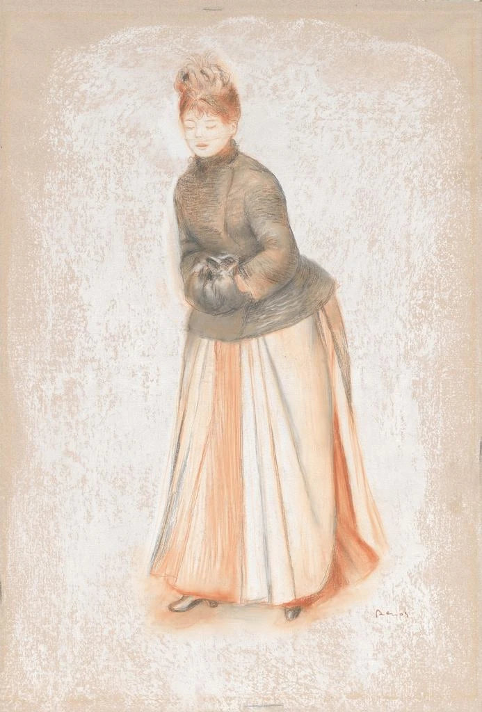 Pierre-Auguste Renoir, impressionismin merkittävä hahmo, onnistui vangitsemaan elämän ilon teoksissaan. Hän syntyi vuonna 1841 ja sai vaikutteita taiteilijoilta kuten Monet ja Degas, mutta kehitti oman tyylinsä, joka on tunnusomaista kirkkaiden värien ja arkipäivän kohtauksien kuvaamiselle. Renoir maalasi lukuisia muotokuvia, joissa hän korosti mallien kauneutta ja eleganssia, usein porvaristosta. "Nuori nainen käsivartaan vasten" kuvastaa täydellisesti hänen kykyään esittää feminiinisyyttä ja armoa, samalla heijastaen Belle Époque -aikaa, jolloin taide ja muoti kietoutuvat yhteen.