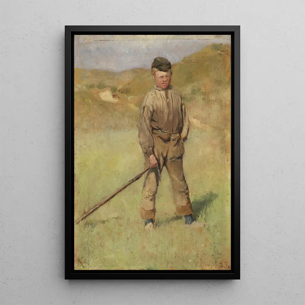Tässä taidegrafiikan reproduktiossa "Nuoren pojan, Hollannin motiivi", Nils Kreuger vangitsee lapsuuden puhtauden ja yksinkertaisuuden. Nuori poika, pukeutuneena perinteisiin hollantilaistaisiin vaatteisiin, on kuvattu maaseudun maisemassa, pehmeän ja lämpimän valon ympäröimänä. Pastellivärit hallitsevat teosta, luoden rauhallisen ja uneksivan tunnelman. Kreugerin tekniikka, joka yhdistää impressionismin ja realismin, mahdollistaa tunteen kokemisen kuin kuulisit tuulen lempeän huminan pelloilla. Tämä taidegrafiikka herättää nostalgiaa yksinkertaisemmista ajoista, jolloin lapsuuden viattous oli juhlapäivä.