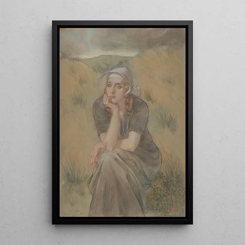 Franz Melchersin taidegrafiikka nuoresta tytöstä herättää harvinaista hienostuneisuutta, vangiten nuoren viattomuuden olemuksen. Pastellivärit, pehmeät ja kirkkaat, sekoittuvat harmonisesti luoden rauhallisen ja rauhoittavan ilmapiirin. Melchersin tekniikka, joka on luonteeltaan hienovaraisia siveltimen vetoja, herättää tämän nuoren naisen eloon, jonka uneksiva katse vaikuttaa kertovan henkilökohtaisesta tarinasta. Tämä teos, täynnä raikkautta, kutsuu katsojan sukeltamaan lempeyden ja pohdinnan maailmaan, jossa jokainen yksityiskohta on huolellisesti suunniteltu herättämään syviä tunteita.