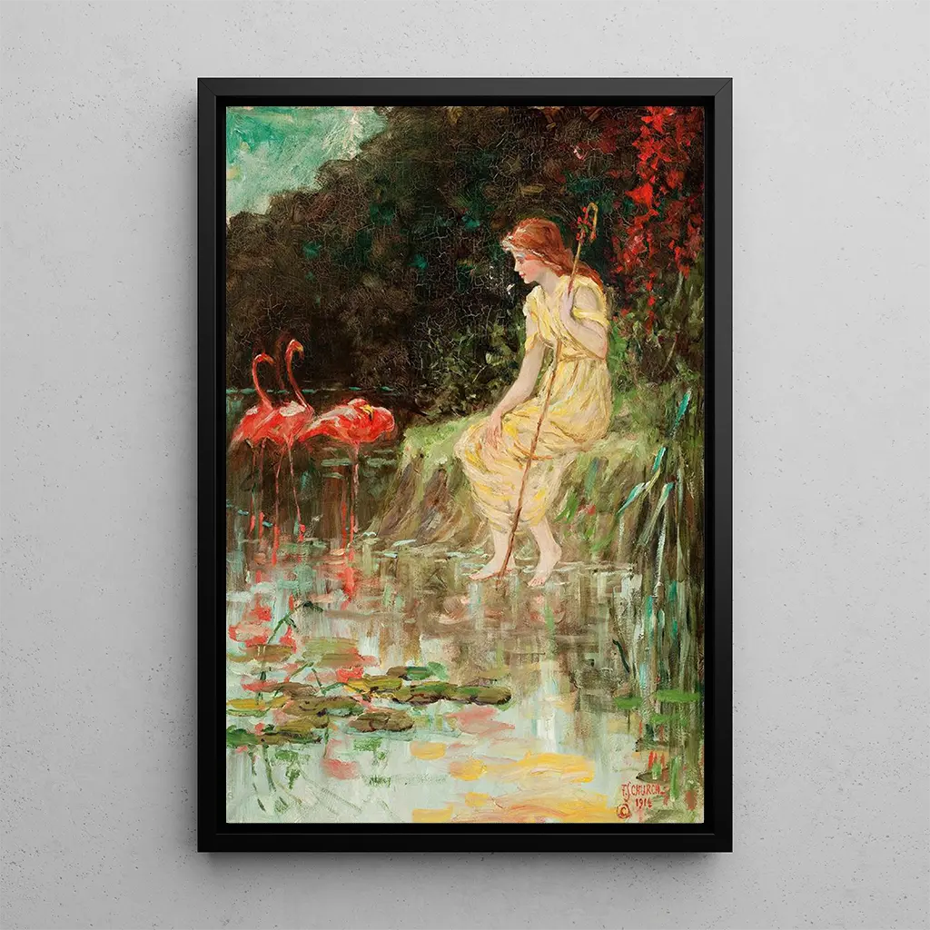 Tässä lumoavassa taidegrafiikassa Frederick Stuart Church kuvaa sulavaa nuorta tyttöä, jota ympäröivät flamants roses, luoden rauhan ja kauneuden tunnelman. Pehmeät vaaleanpunaiset ja siniset sävyt muodostavat harmonisen kontrastin, kun taas valo leikkii lintujen höyhenissä ja veden heijastuksissa. Tasapainoinen koostumus, jossa ihmishahmo sulautuu luontoon, kutsuu rauhalliseen pohdiskeluun. Tämä taidegrafiikka nuoresta tytöstä ja flamingoista on todellinen ylistys naisellisuudelle ja luonnon kauneudelle, kuljettaen katsojan unelmien maailmaan.