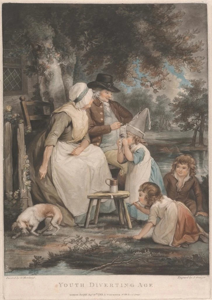 Kohteessa "La jeunesse divertissant la vieillesse" George Morland vangitsee hetken hellyyttä ja iloa. Kompositio esittelee eloisia nuoria, jotka ympäröivät ikääntynyttä henkilöä, joka näyttää antautuvan hetkessä vallitsevalle keveyydelle. Lämpimät ja kirkkaat värit, vihreän ja keltaisen sävyillä, luovat onnellisuuden ja yhteisöllisyyden tunnelman. Morlandin tekniikka, joka taitavasti yhdistää realismia ja tiettyä idealisointia, luo koskettavan kontrastin nuoruuden elinvoiman ja viisauden välillä. Tämä taidegrafiikka herättää lempeää melankoliaa, juhlistaen elämää eri ikäkausina.