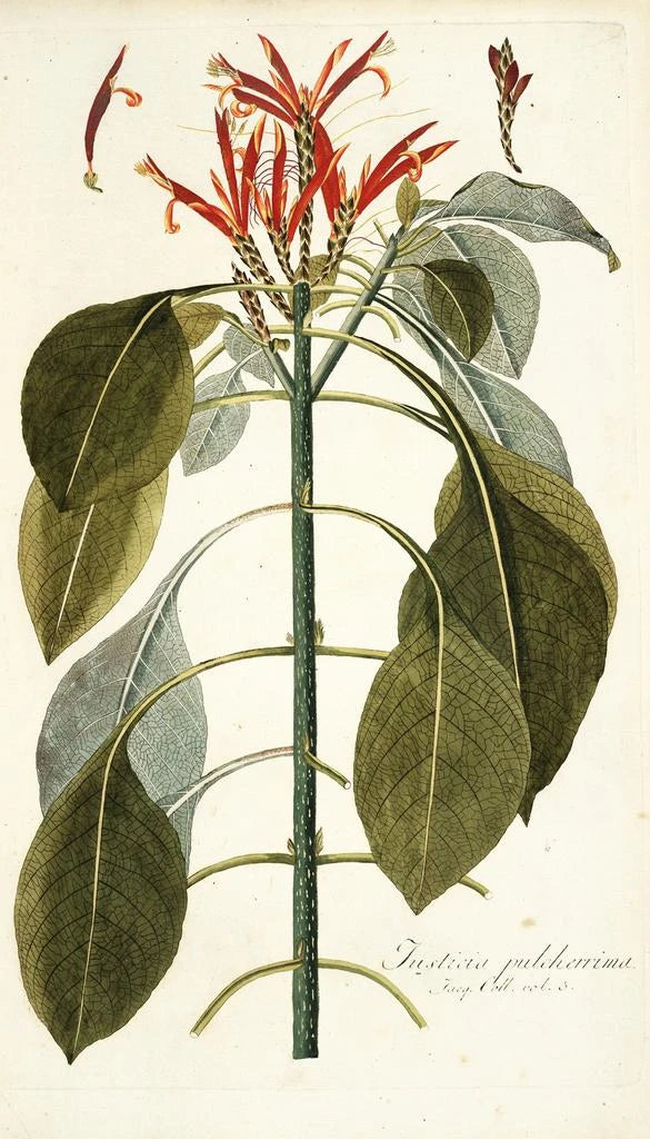 L reproduction de Justicia pulcherrima sukelsi meidät elinvoimaisiin maailmoihin, joissa luonto ilmaisee itseään loistokkaasti. Kirkkaan punaiset ja oranssit sävyt erottuvat vihreän taustan päällä, luoden vaikuttavan kontrastin. Vesiväritekniikka, jota käyttää Nikolaus Joseph Freiherr von Jacquin, mahdollistaa kukkien hienostuneisuuden vangitsemisen samalla tarjoten poikkeuksellisen kirkkauden. Tämän teoksen tunnelma herättää tropiikkien lämpöä ja kutsuu luonnonkauneuden ihailuun.