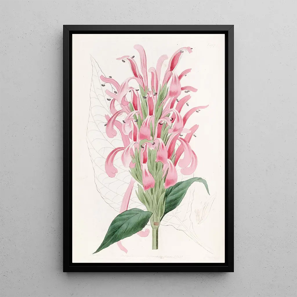 Taidegrafiikka Justicia väri iho -taulusta Sydenham Edwards vie meidät kasvitieteelliseen maailmaan, jossa pehmeys ja keveys hallitsevat. Vaaleanpunaisen ja vihreän sävyt sekoittuvat harmonisesti, luoden rauhoittavan ilmapiirin. Jokainen terälehti näyttää vangitsevan valon, paljastaen yksityiskohtia, jotka osoittavat tarkkaa luonnon havainnointia. Vesiväritekniikka, jota käytetään hienovaraisesti, mahdollistaa kukkien läpinäkyvyyden kuvaamisen, kun taas herkkä tausta korostaa orgaanisten muotojen kauneutta. Tämä teos kutsuu rauhalliseen pohdintaan, jossa jokainen katse paljastaa uuden puolen kukkaloiston loistosta.