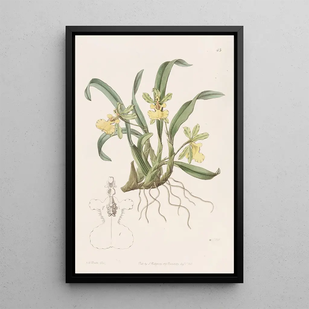 L'Oncidium L à une fleur, Sydenham Edwardsin teos, viittaa eksoottisten kukkien keveyteen ja eleganssiin. Tämä taulu, joka on täynnä yksityiskohtia, esittää kirkkaan keltaisia ja violetteja sävyjä, luoden vaikuttavan kontrastin, joka kiinnittää katseen. Vesiväritekniikka, jota on käytetty hienovaraisesti, mahdollistaa petalien läpinäkyvyyden ja varsien hienostuneisuuden vangitsemisen. Tämän taidegrafiikan välittämä tunnelma on sekä rauhoittava että inspiroiva, kutsuen pitkäkestoiseen luonnon ihmeiden tarkasteluun.