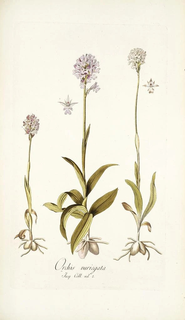 Nikolaus Joseph Freiherr von Jacquin, botaniste et artiste du XVIIIe siècle, a su allier science et art dans ses œuvres. Né en 1727 en Autriche, il a été influencé par les découvertes botaniques de son époque et a voyagé à travers le monde pour étudier la flore. Ses illustrations, dont Orchis variegata fait partie, sont considérées comme des références dans le domaine de l'illustration botanique. Jacquin a contribué à la connaissance des plantes exotiques en Europe, et son travail a eu un impact durable sur l'art et la science, faisant de lui une figure emblématique de son temps.
